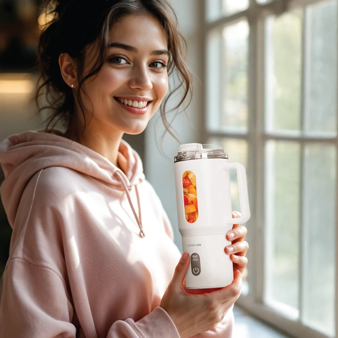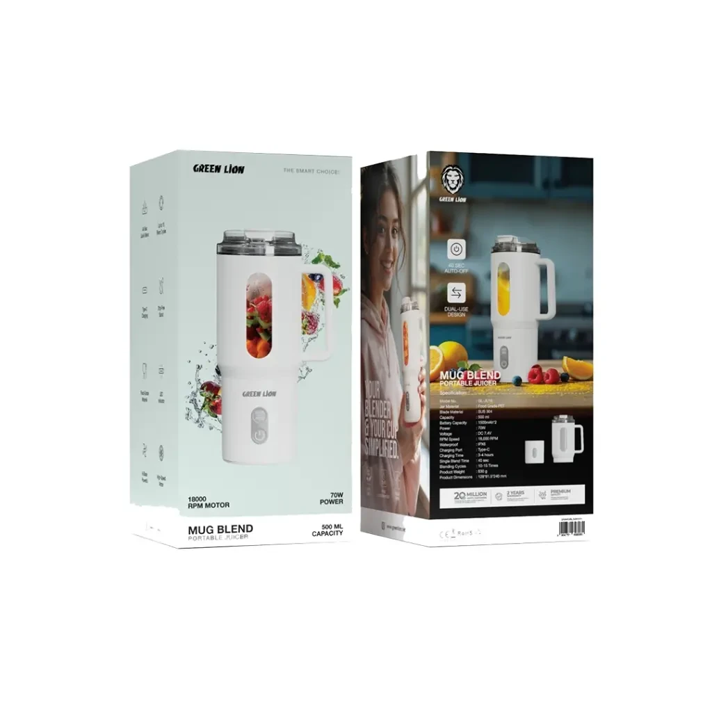 The Green Lion Mug Blend Portable Juicer combines modern design with powerful performance, making it an essential gadget for daily use. With a 70W high-speed motor running at 18,000 RPM, it blends smoothies, shakes, and juices quickly and efficiently. Its 500mL capacity is ideal for on-the-go lifestyles. Powered by dual 1500mAh batteries, it can complete up to 15 blend cycles on a single charge. A 40-second quick blend feature, LED indicator, and Type-C charging port enhance convenience. Built with 6 powerful SUS 304 stainless steel blades, it ensures smooth blending every time. The IPX6 waterproof rating provides durability and easy cleaning, while the drip-free spout keeps your blending experience mess-free. Compact, stylish, and reliable, it’s your perfect travel-friendly juicer.