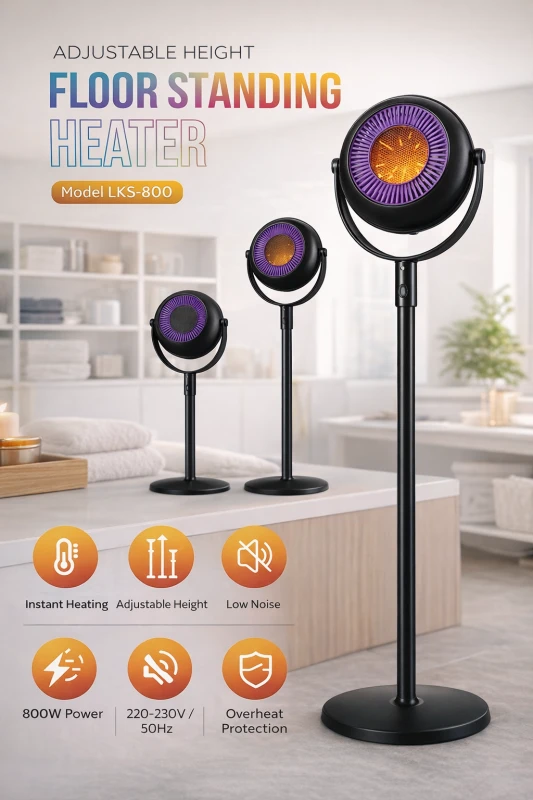 The Adjustable Height Floor Standing Heater is a compact and efficient solution to keep your space warm during cold days. It features instant heating with wide heat distribution, making it suitable for rooms and personal use. Designed with low-noise operation, no glaring light, and built-in overheat protection, it provides safe and comfortable warmth. The adjustable height design allows flexible placement to suit different spaces and needs.