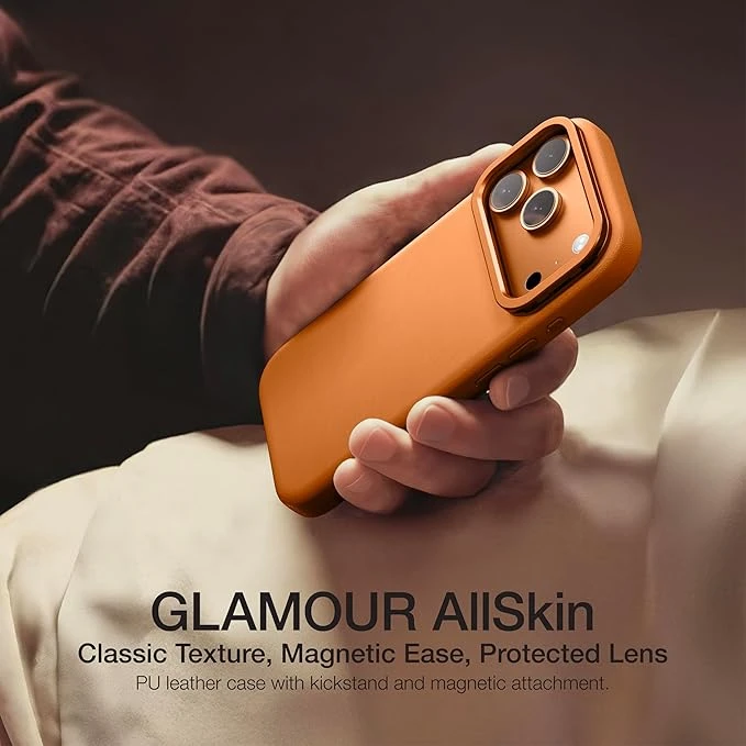 The AmazingThing Glamour AllSkin LenStand MagSafe Case for iPhone 17 Pro redefines premium protection with elegance and innovation. Designed with smooth vegan leather that feels soft to the touch, it develops a timeless texture over time, blending style with durability. The integrated metal kickstand provides dual functionality—acting as a camera lens protector when closed and transforming into a hands-free stand when opened.