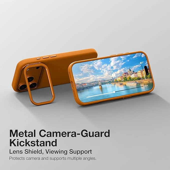 Built-in metal camera-guard kickstand for lens protection and hands-free viewing