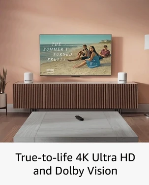 The device comes with the Alexa Voice Remote (3rd Gen), enabling voice control for easy navigation and smart home integration. It features HDMI 2.1 output with ARC input support and a micro USB port for power.