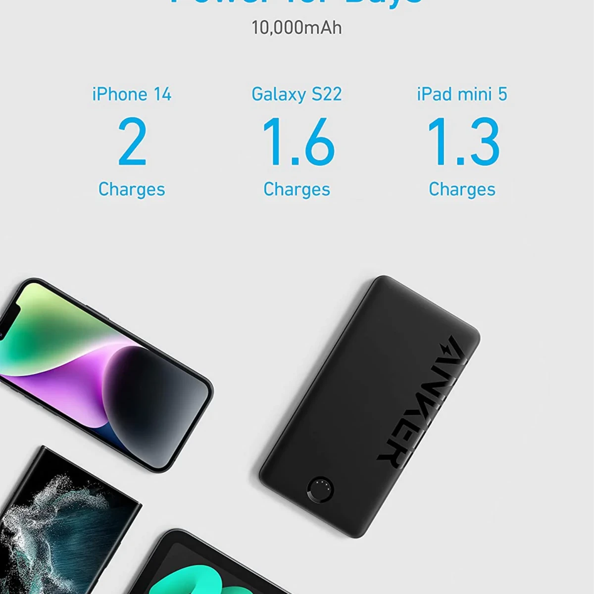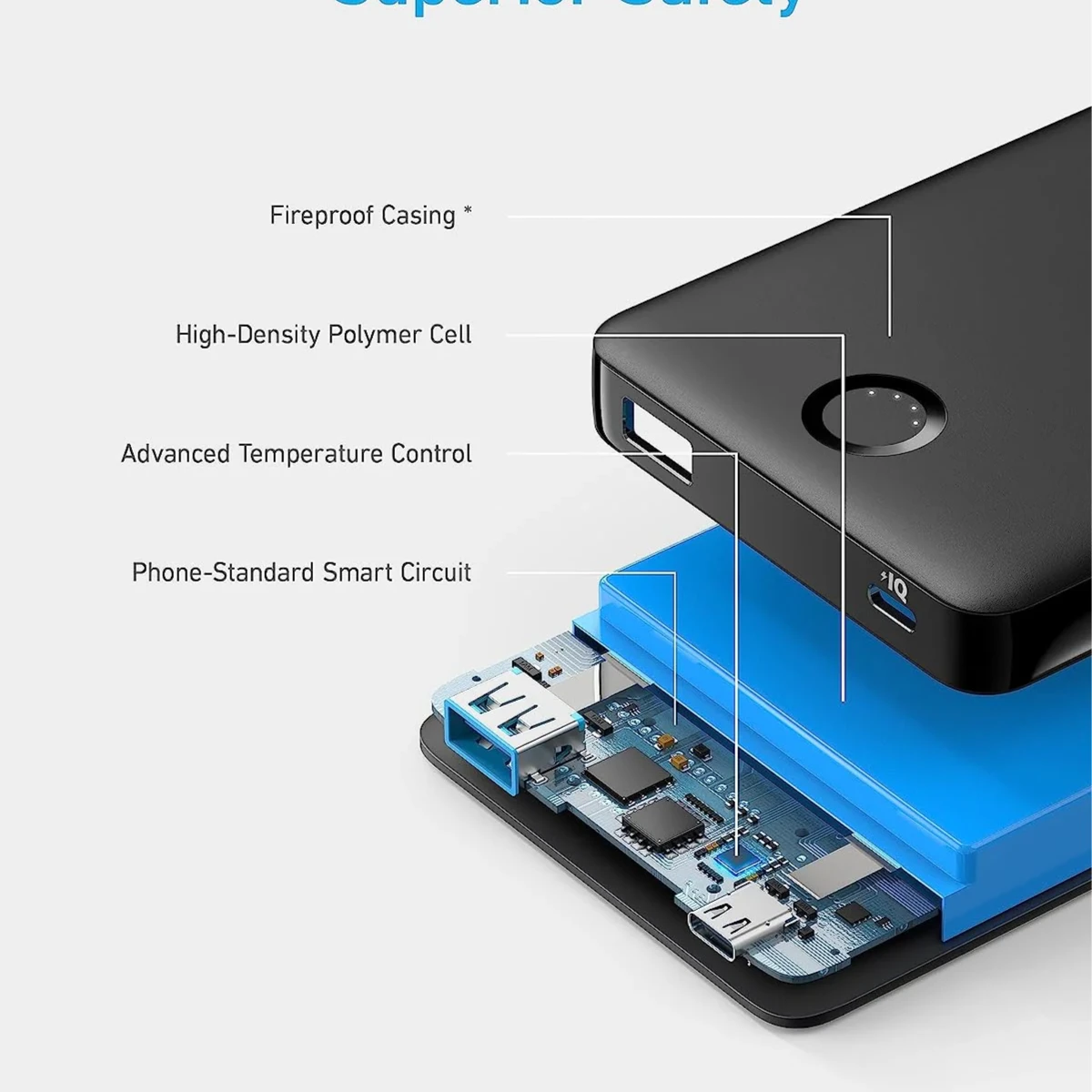 Never Run Out of Power : The 10,000mAh capacity enables this power bank to charge your iPhone 14 twice and your iPad mini 5 up to 1.3 times. Dual Charging : The USB-C port supports two-way fast charging for added convenience. Extremely Safe to Use : With a fireproof casing, high-density polymer cell, smart circuit, and temperature control, this power bank provides reliable protection while charging your devices. Simultaneous Charging : With the ability to charge two devices at once at up to 12W max, this power bank is perfect for those on the go with multiple devices.