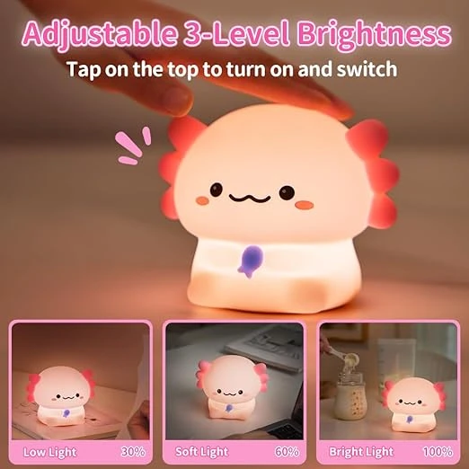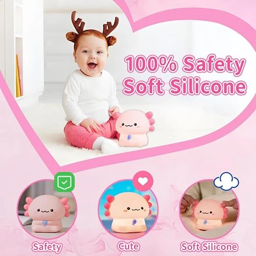 The Baby Newt Silicone Night Lamp is an adorable axolotl-inspired lamp with sparkling eyes, a sweet smile, and a cute little fish in its hands, making it both a decoration and a comforting light. Made from safe, non-toxic, and thick silicone, it is soft to touch, skin-friendly, and resistant to falls and collisions. The lamp emits a warm, flicker-free glow that is gentle on the eyes, perfect for children and adults alike. With three adjustable brightness levels and a 30-minute timer, it provides flexibility for bedtime, reading, or nursery use. A built-in rechargeable battery makes it portable and wireless, ideal for bedrooms, dorms, camping, or traveling. Packaged beautifully, it also makes a perfect gift for birthdays, holidays, or special occasions.
