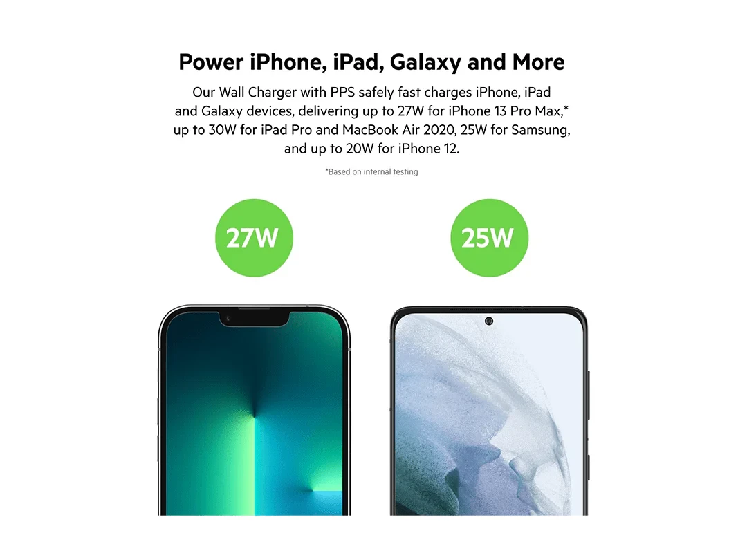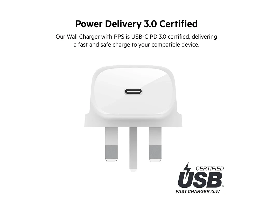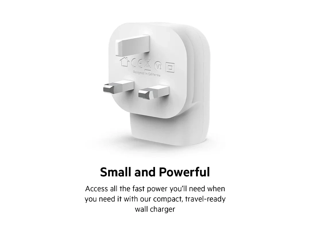 The Belkin BoostCharge 30W USB-C Wall Charger with PPS delivers fast, safe, and efficient charging for your devices. With USB-C Power Delivery 3.0 and PPS technology, it automatically adjusts power output for optimal performance. Capable of charging an iPhone 13 from 0–50% in just 24 minutes or a Samsung Galaxy S22 Ultra in 21 minutes, it’s ideal for on-the-go charging. Its slim, flat-to-wall design makes it perfect for tight spaces, while the compact and travel-ready build ensures convenience anywhere.