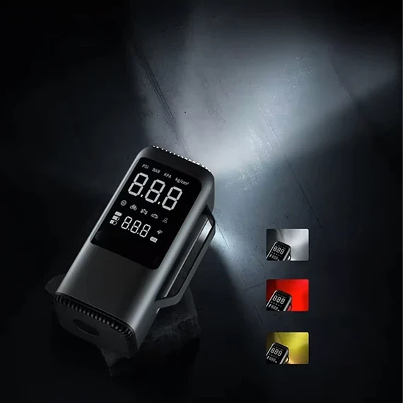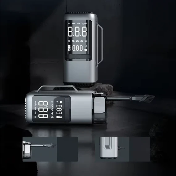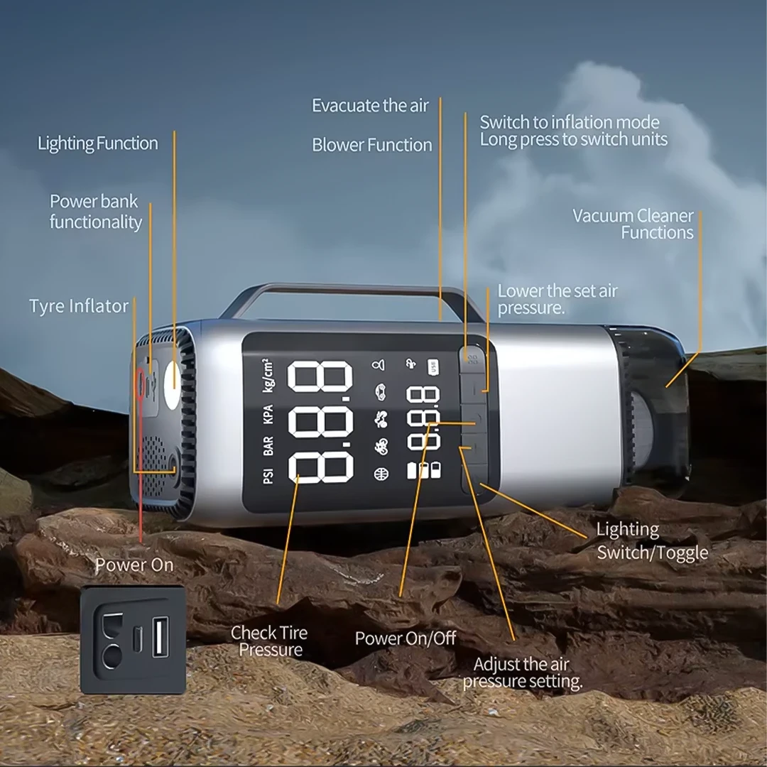 Equipped with an air compressor that can be used to inflate car tires, bicycles, balls, or other items. The desired air pressure can be adjusted through a simple control interface, and it features a digital screen that displays the pressure level. It also has an automatic stop feature when the desired pressure is reached, making it safe and easy to use.