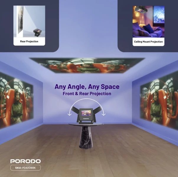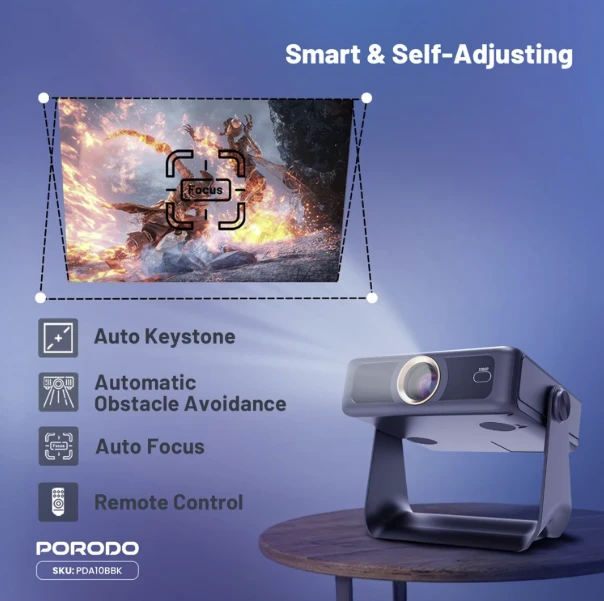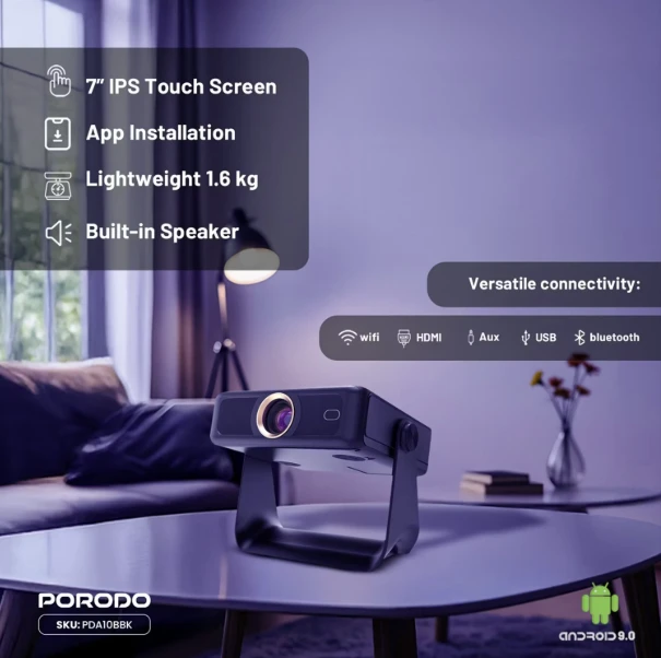 The Porodo Optivis Smart HD Projector delivers a powerful cinematic experience in a compact and modern design. Equipped with a 2.69-inch HD LCD display and an additional 7-inch capacitive-touch smart tablet screen, it ensures bright, colorful, and clear visuals at 1280×720 resolution. With 200 ANSI Lumens, the projector performs impressively in low-light environments, offering screen sizes from 30" up to 250" for flexible viewing in any space. Intelligent features like Auto Focus, Auto Keystone Correction, and Automatic Obstacle Avoidance provide a smooth, hassle-free setup. Its long-lasting LED light source offers over 10,000 hours of use, making it ideal for movies, gaming, presentations, and home entertainment.