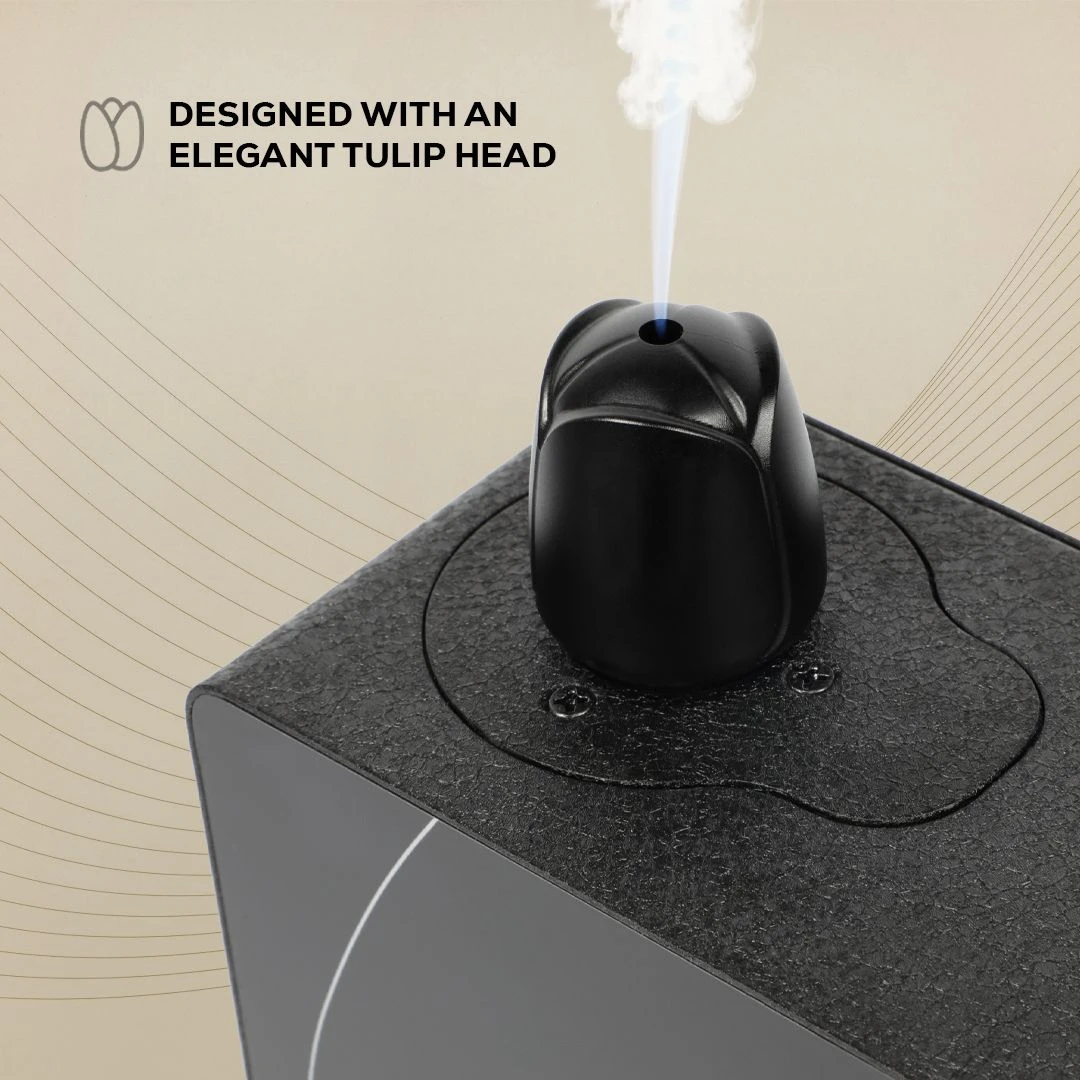 It uses nano micro-particle mist technology for long-lasting fragrance, with smart app control to set intensity and schedules—wrapped in a stylish tulip design that fits home, office, and wellness spaces.