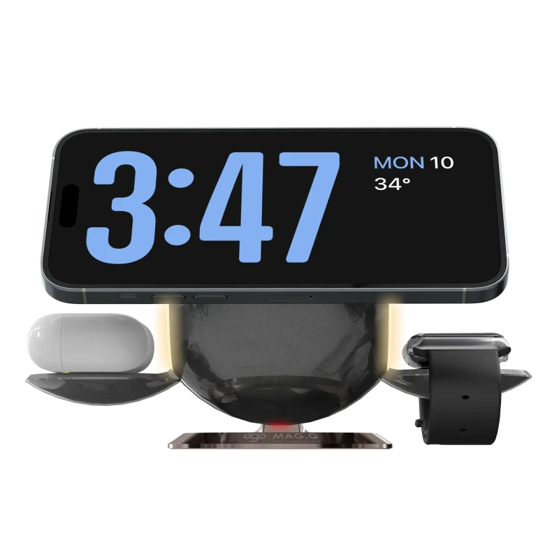 The EGO Mag.Q 3-in-1 wireless charging station brings convenience and elegance to your desk or bedside with MagSafe-compatible 15 W wireless charging for iPhone, plus Qi support for other smartphones. With foldable design, adjustable angles, strong N48 magnet alignment and a cool charging temperature (~38°C), it’s designed to charge your phone, watch and earbuds all in one sleek unit.