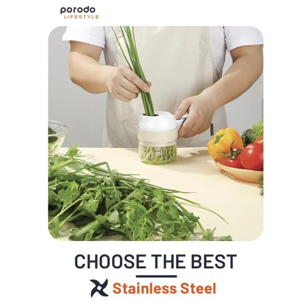 The Porodo 45W 4-in-1 Portable Handheld Food Chopper 1200RPM is a compact cordless kitchen helper made to speed up meal prep with minimal effort. Its sharp stainless-steel blades can peel, chop, slice, and dice vegetables quickly and evenly, making it ideal for salads, garnishes, and everyday cooking. Powered by a 45W motor running at 1200RPM, it processes ingredients in just seconds, while the built-in 1200mAh battery delivers up to 1 hour of working time on a single charge. Type-C charging keeps recharging simple and modern, and the easy-to-clean design helps reduce mess and time spent on cleanup. Lightweight and portable, this handheld chopper is perfect for small kitchens, quick cooking sessions, and on-the-go use.