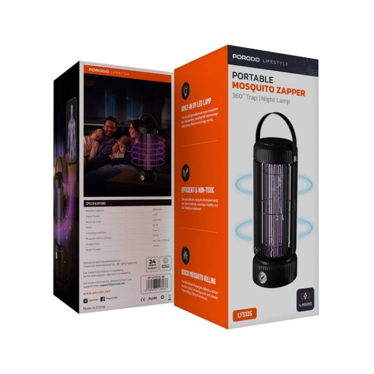 The Porodo Lifestyle Portable Mosquito Zapper is the ideal method to effectively and safely remove insects. The product gets rid of mosquitoes fast and safely. It works with a 3000V insect-killing voltage, avoiding harmful chemicals. The built-in UV LED bulb serves as a 360° night light to brighten your area and attract insects for efficient capturing. It's great for indoor and outdoor use. Its 2000mAh battery lasts up to 4 hours on one charge. The 4.5W rated power guarantees peak performance, and the Type-C charging interface makes recharging quick and easy. This zapper provides a safer, eco-friendly option to regular mosquito killers. It's designed to be effective and non-toxic. Porodo Lifestyle Portable Mosquito Zapper is easy to maintain and offers dependable mosquito control anywhere you need it, thanks to its 5V/1A input.