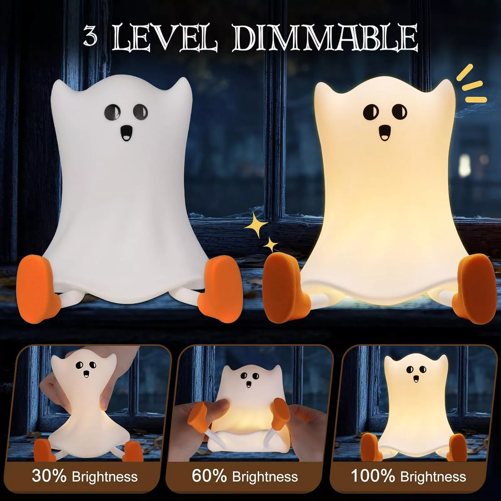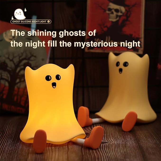Bring comfort and fun to bedtime with this adorable Ghost-shaped night light. Made from soft, kid-safe silicone, it features 3 levels of adjustable warm light controlled by a simple tap.Perfect for nurseries, bedrooms, or as a quirky gift, this touch-sensitive lamp is both cute and practical—ideal for babies, toddlers, and kids. Features: Adorable Ghost Design – Fun and unique look kids love 3 Brightness Levels – Adjustable warm light for any time of night Touch Control – Tap to turn on/off or change brightnessSafe, Soft Silicone – BPA-free, squeezable, and gentle for little hands Rechargeable Battery – Long-lasting use, USB charging included Great Gift Idea – Perfect for baby showers, birthdays, and holidays A fun and functional bedside companion for peaceful nights.