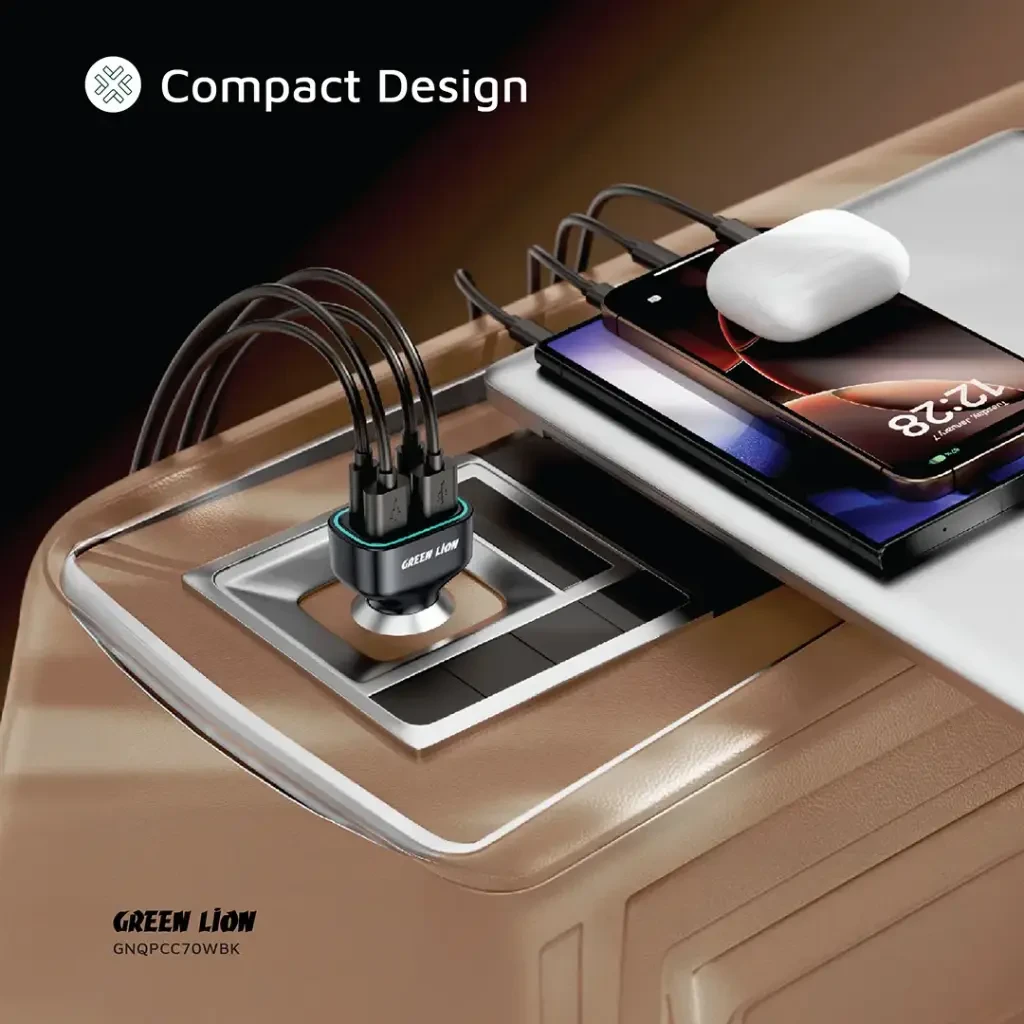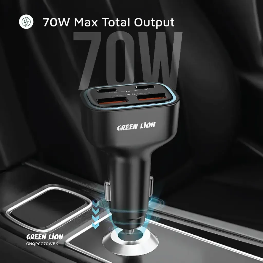 The Green Lion 4-Port Car Charger 70W Max is a powerful and versatile charging companion for all your travels. Built with durable PC material, it supports 12V–24V input, making it suitable for almost any vehicle. With two USB-C and two USB-A ports, it provides fast charging of up to 35W each via PD and QC, while delivering a total combined output of 70W. This allows you to charge up to four devices simultaneously with ease. Designed with safety in mind, it includes charging protection to keep your devices secure. Its compact body and blue ambient LED make it both practical and stylish, ensuring convenience even in low-light conditions.