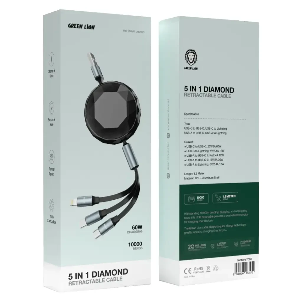 The Green Lion Diamond 5-in-1 retractable cable offers multiple charging connectivity solutions: USB-C to USB-C, USB-C to Lightning, USB-A to USB-C, and USB-A to Lightning. This cable features strong current handling and fast charging with two types: USB-C to USB-C (up to 60W), and USB-A to USB-C (up to 30W). Constructed with a durable TPE shell and aluminum, it ensures safety and stability while remaining reliable despite bending up to 10,000 times. It also boasts a data transfer speed of approximately 480Mbps and is fully compatible with many other devices for charging and syncing.