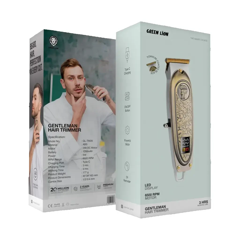 The Green Lion Gentleman Hair Clipper offers precision and ease for a professional shaving experience. Equipped with a 280 DC motor, it delivers a powerful cutting experience at an impressive speed of 6,500 RPM for a smooth and efficient shave. The 1200mAh battery provides 3 full hours of continuous clipping on a full charge and charges in 3 hours from the Type-C charging port for convenient and easy recharging. The 5W power output ensures maximum performance for a clean cut every time. With an on/off switch for simple operation, this clipper is designed with a powerful motor that can easily handle all hair types. The oil reminder ensures your trimmer stays in tip-top shape, and the LED display allows you to monitor battery life and performance. Made from durable ABS, the Green Lion Gentleman Hair Clipper is a durable and efficient grooming tool for the modern man.