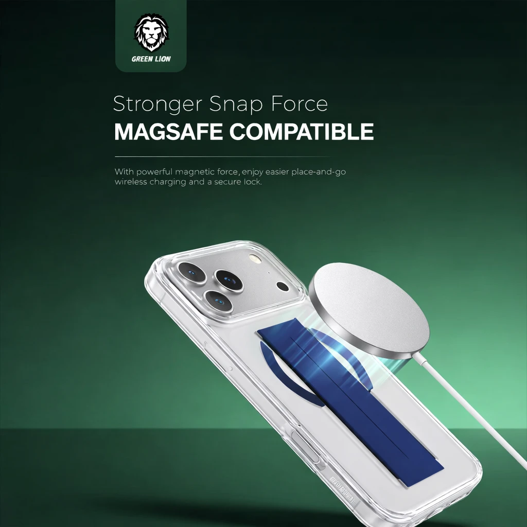 The Green Lion MagSafe Grip Case for iPhone 17 Pro is built to deliver strong everyday protection with a clean, practical look. Designed with military-grade shock protection, it helps shield your phone from daily drops, bumps, and impacts. Raised edges around the screen and camera provide extra guarding for the most sensitive parts of your device, while the anti-yellowing clear back keeps the case looking fresh over time. The MagSafe-compatible design ensures smooth, secure alignment with MagSafe chargers and accessories, so you can snap on power or add-ons with confidence. A built-in comfortable grip makes the phone easier to hold and reduces the chance of accidental slips. For users who want a balance of protection, utility, and style, this case is a sleek everyday companion for the iPhone 17 Pro.