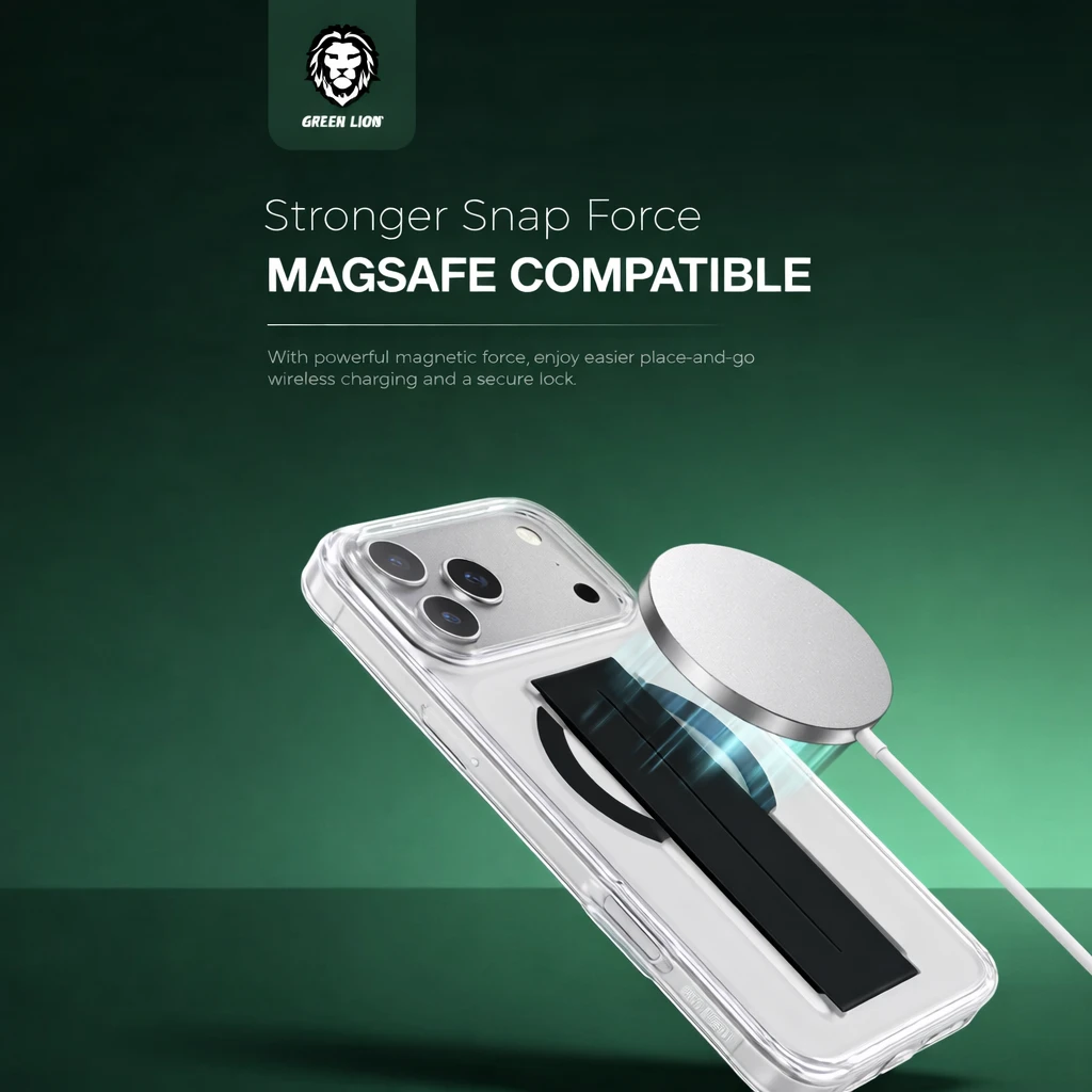 The Green Lion MagSafe Grip Case for iPhone 17 Pro Max is built to deliver strong everyday protection with a clean, practical look. Designed with military-grade shock protection, it helps shield your phone from daily drops, bumps, and impacts. Raised edges around the screen and camera provide extra guarding for the most sensitive parts of your device, while the anti-yellowing clear back keeps the case looking fresh over time. The MagSafe-compatible design ensures smooth, secure alignment with MagSafe chargers and accessories, so you can snap on power or add-ons with confidence. A built-in comfortable grip makes the phone easier to hold and reduces the chance of accidental slips. For users who want a balance of protection, utility, and style, this case is a sleek everyday companion for the iPhone 17 Pro Max.