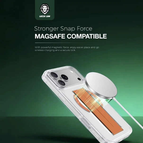 The Green Lion MagSafe Grip Case for iPhone 17 Pro Max is built to deliver strong everyday protection with a clean, practical look. Designed with military-grade shock protection, it helps shield your phone from daily drops, bumps, and impacts. Raised edges around the screen and camera provide extra guarding for the most sensitive parts of your device, while the anti-yellowing clear back keeps the case looking fresh over time. The MagSafe-compatible design ensures smooth, secure alignment with MagSafe chargers and accessories, so you can snap on power or add-ons with confidence. A built-in comfortable grip makes the phone easier to hold and reduces the chance of accidental slips. For users who want a balance of protection, utility, and style, this case is a sleek everyday companion for the iPhone 17 Pro Max.