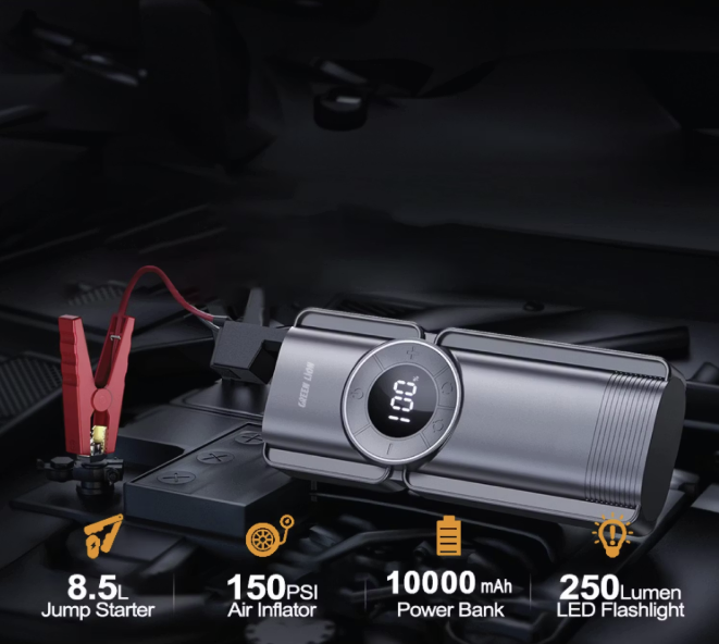 The Green Lion Portable Jump Starter is your reliable roadside assistant, delivering up to 800A peak current to jump-start 12V car batteries quickly and safely.Powered by a 10,000mAh battery, it offers multiple jump starts per charge. This versatile device also includes a 150 PSI-rated air pump for tire inflation and an LED SOS mode for emergencies. Compact and easy to carry, it's a must-have for every driver. Key Features: 12V jump start for car batteries 10,000mAh high-capacity battery 800A peak current for powerful starts Built-in air pump with 150 PSI rated pressure LED SOS emergency light mode Portable and easy to use