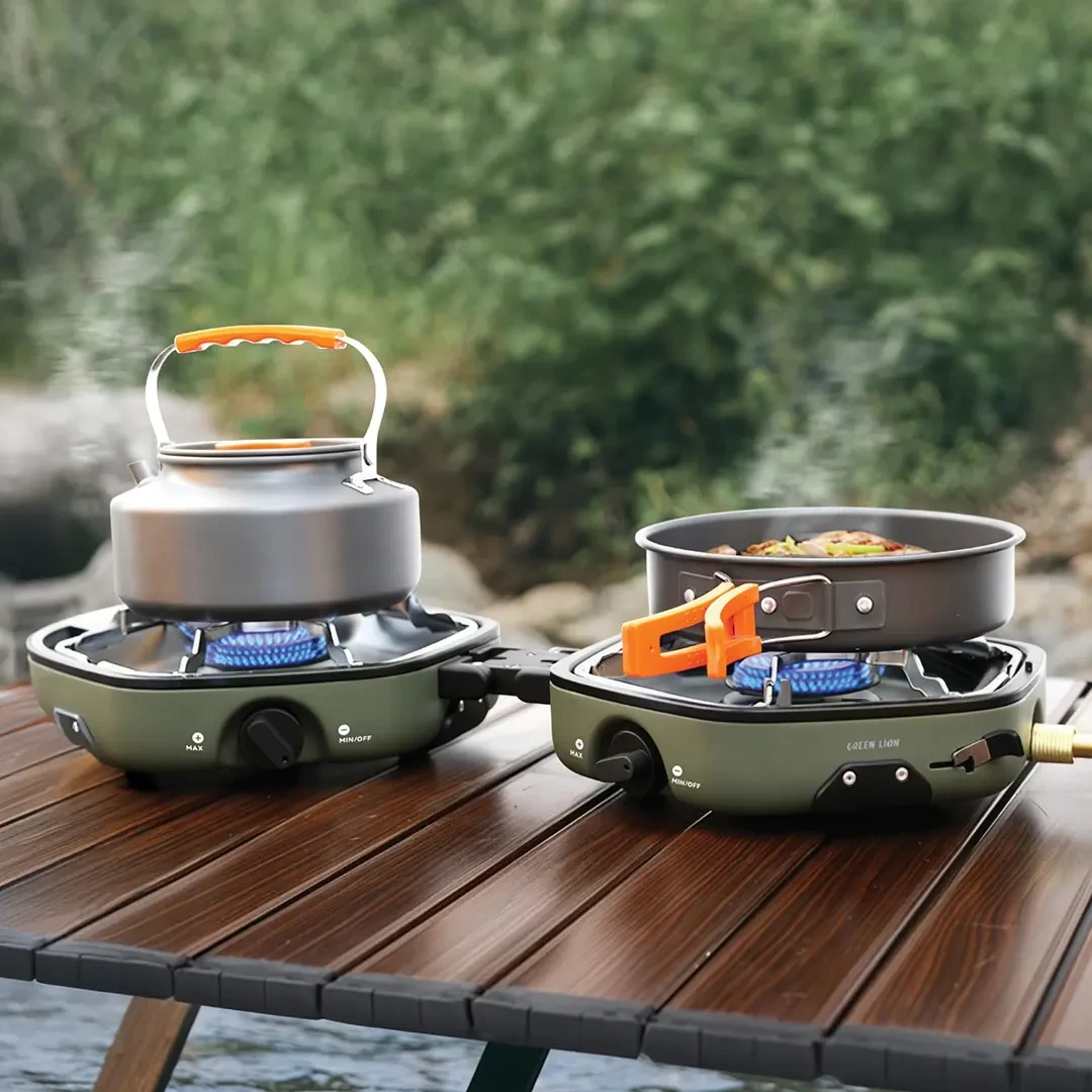 The Green Lion Twin Flame Foldable Camping Stove is perfect for campers and outdoor enthusiasts who need heavy-duty and versatile cooking. Made from robust SPCC copper and heat-resistant plastic, it features two stainless steel burners with 2.2kW power each for fast and efficient cooking. Compatible with butane and propane gas, it consumes 160g/h per burner. The stove includes a storage bag, is highly foldable and portable, and has a 90cm gas pipe with adjustable burners and piezoelectric ignition for precise flame control. Its heat-resistant shell ensures safety, while each burner can support up to 5kg. Combining durability, portability, and high performance, this stove is ideal for outdoor adventures.