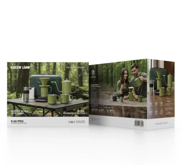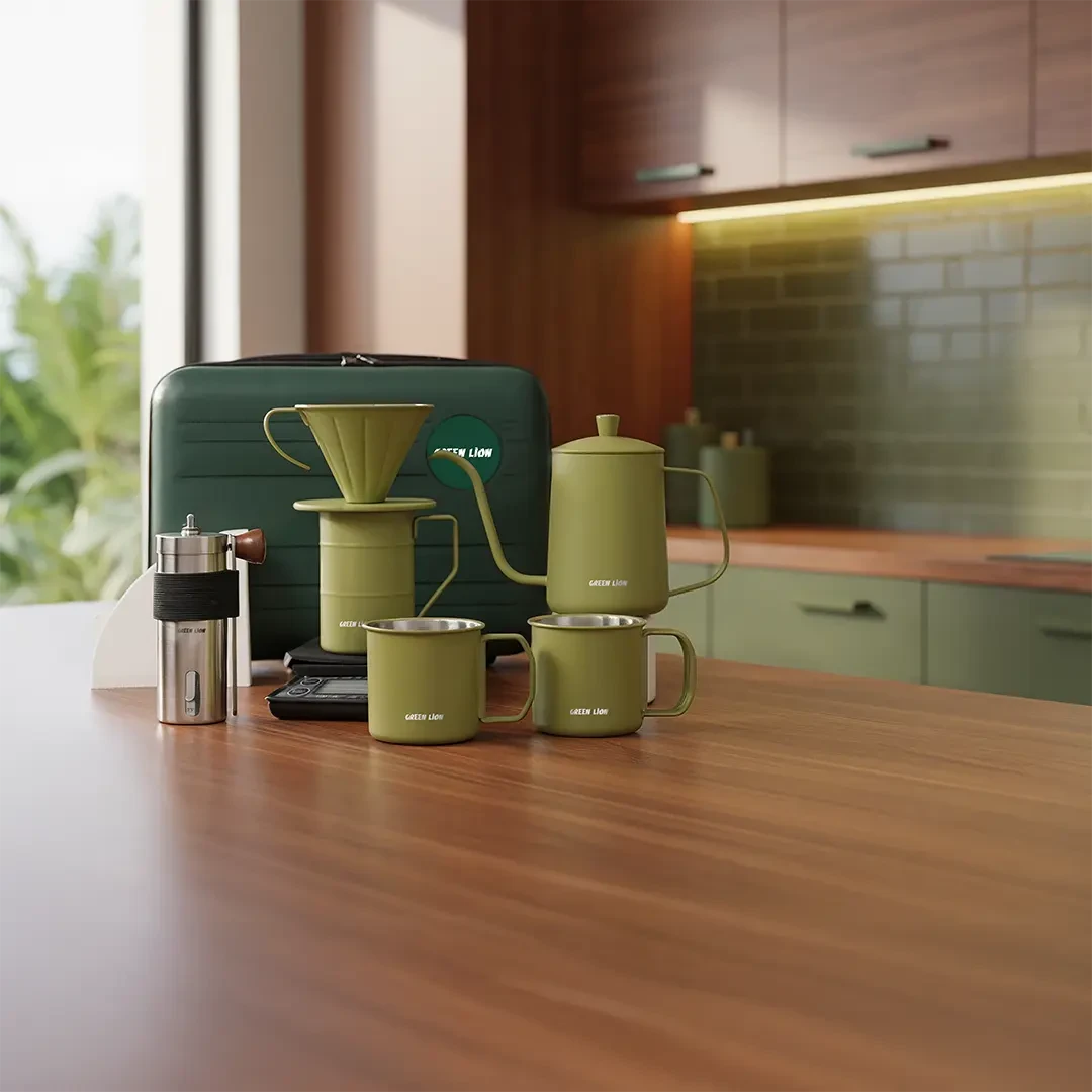 The Green Lion V-60 Pro Coffee Maker Set – Green is a complete 7-in-1 pour-over kit for coffee lovers who want café-style brewing at home, in the office, or on the go. The set includes a gooseneck kettle for precise pouring, an adjustable hand grinder for consistent coffee grounds, and a V60-style pour-over dripper for clean, aromatic extraction. You also get two stainless steel cups to enjoy your brew, a precision scale to control your recipe, and 100 V60-02 paper filters to keep your coffee smooth and clear. All items are neatly packed in a travel case, making it easy to carry for trips, camping, or outdoor brewing, so you can enjoy professional-style pour-over coffee anywhere.