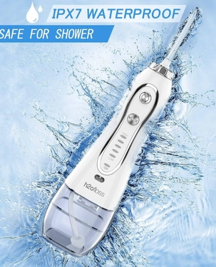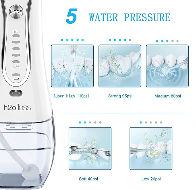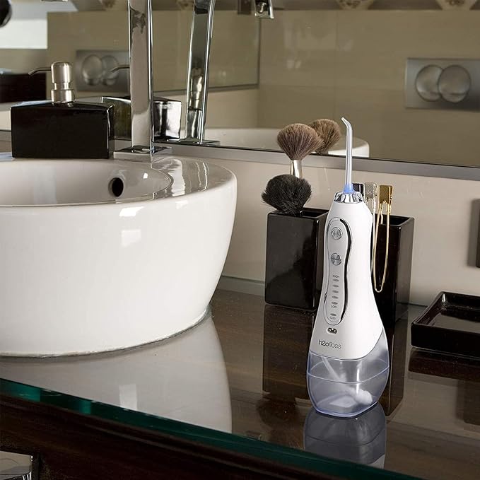 Introducing the H2ofloss Cordless Water Dental Flosser, a portable and rechargeable oral irrigator designed for ultimate teeth cleaning. This compact teeth cleaner, available in white, offers multiple pressure settings to suit your comfort level. With a unit count of 550, it provides extensive use, perfect for both home and travel. The H2ofloss Water Flosser is battery-powered, ensuring convenient usage anytime, anywhere. It promotes oral health by removing plaque and improving gum health, making it an ideal tool for personal oral care, including cleaning teeth, braces, and dental implants. Simply fill the reservoir with water, select your preferred pressure setting, aim the flosser at the gumline, and turn it on. Made of durable polycarbonate material, this oral irrigator is both lightweight and robust. The product dimensions are not provided, but it is designed for easy handling and storage. For care instructions, we recommend rinsing the flosser with clean water after each use and charging it when necessary. The H2ofloss Cordless Water Dental Flosser is a perfect blend of functionality, portability, and efficiency, promising a superior oral care experience.