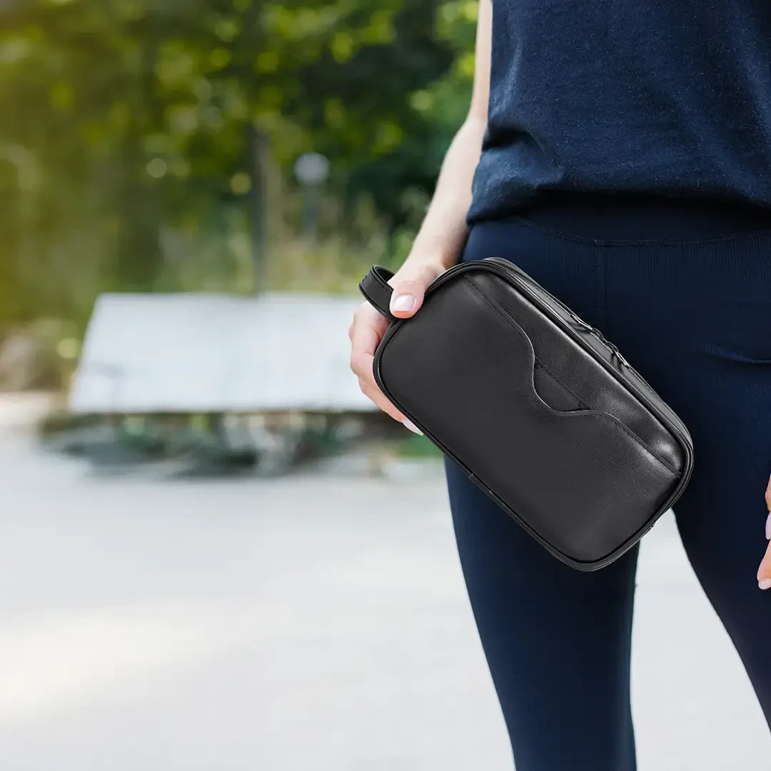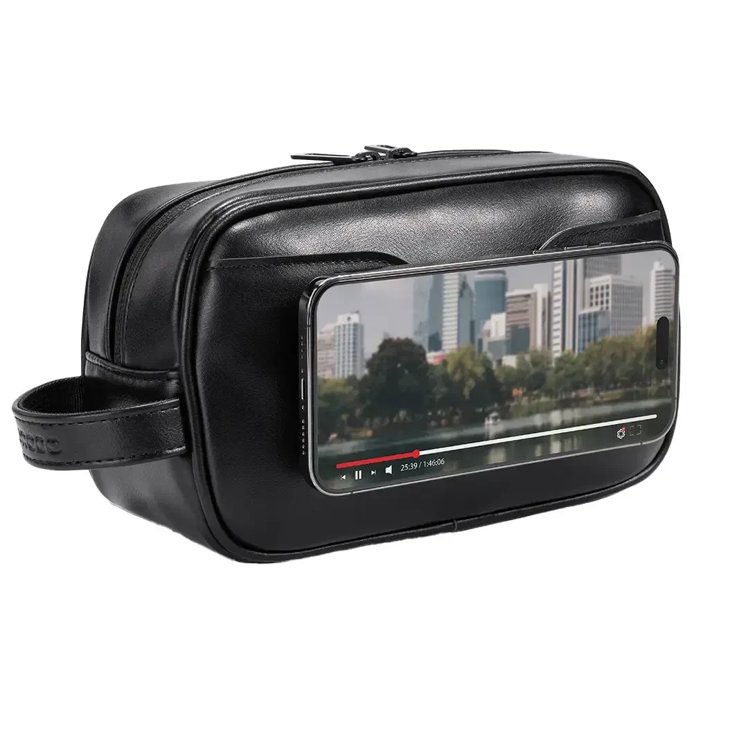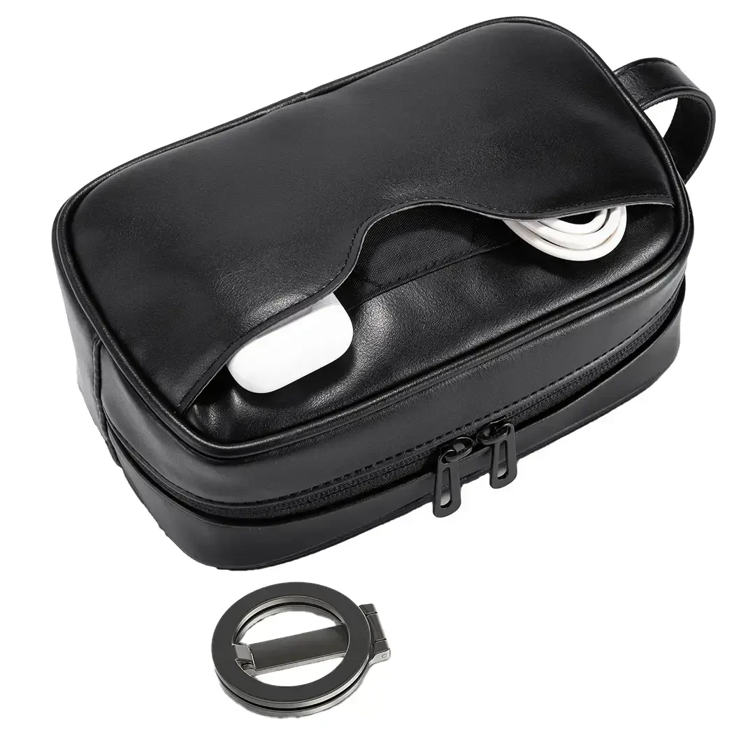 The Porodo MagSafe Travel Organizer Pouch with Phone Holder is a sleek, all-in-one solution for travellers who like to keep everything neat, secure, and easy to reach. Crafted from premium PU leather in a classic black finish, it delivers both elegance and durability for daily use and frequent trips. Inside, an integrated MagSafe holder with strong magnets keeps your compatible phone firmly in place, giving you quick access on the go. Multiple storage compartments help you organize cables, chargers, earbuds, and small gadgets, while the compact, lightweight design slips easily into your backpack, handbag, or luggage. With a practical carry handle and smooth two-way zipper, this pouch blends style and function to keep your essentials in one tidy, travel-ready kit.