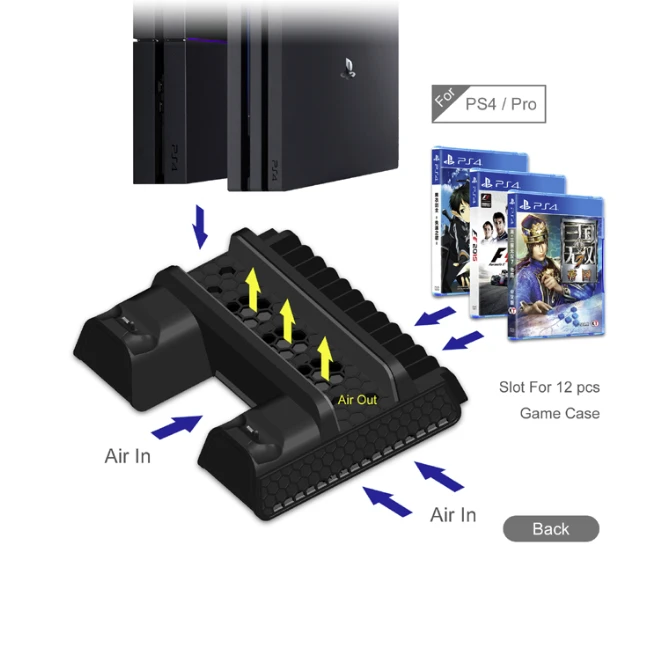 Multi-functional design,work as vertical cooling fan stand as well as dual charging dock station