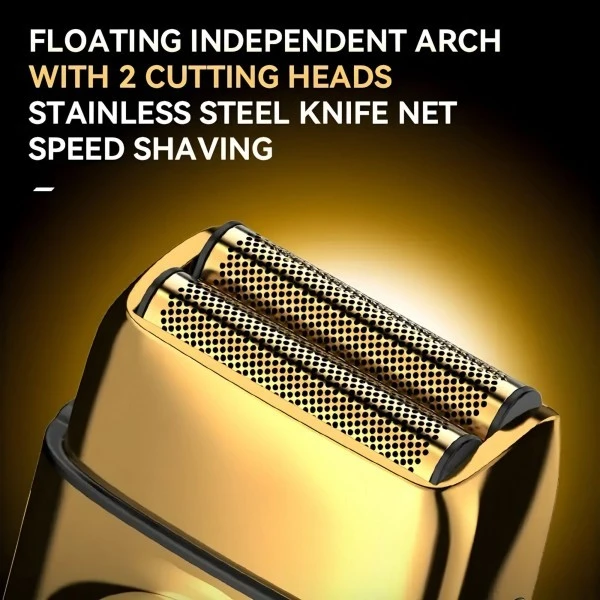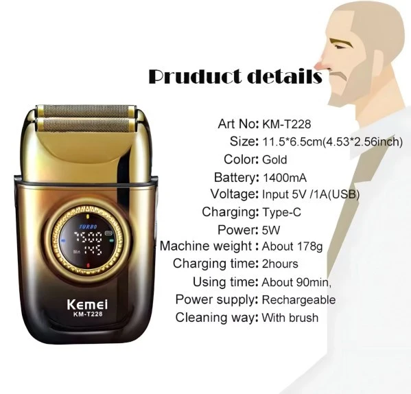Enjoy a precise and smooth shave with the Kemei KM-T228, combining power with elegance. Its golden finish adds a luxurious touch, while the high-speed 7500 RPM motor delivers fast and efficient performance. The digital display keeps you informed about battery status and essential information, with three adjustable speeds to suit different hair thicknesses. Dual stainless steel blades ensure a close, irritation-free shave, and cleaning is simple with the included brush — no water needed.