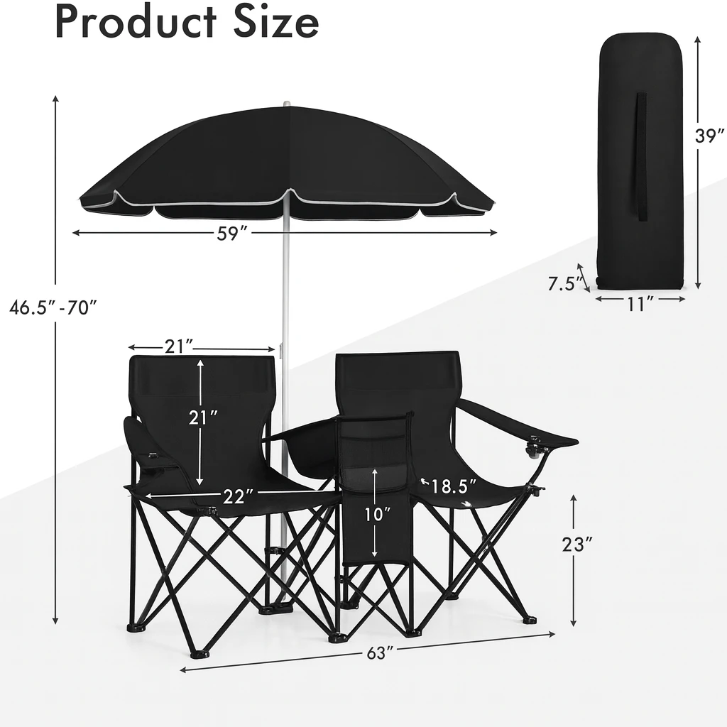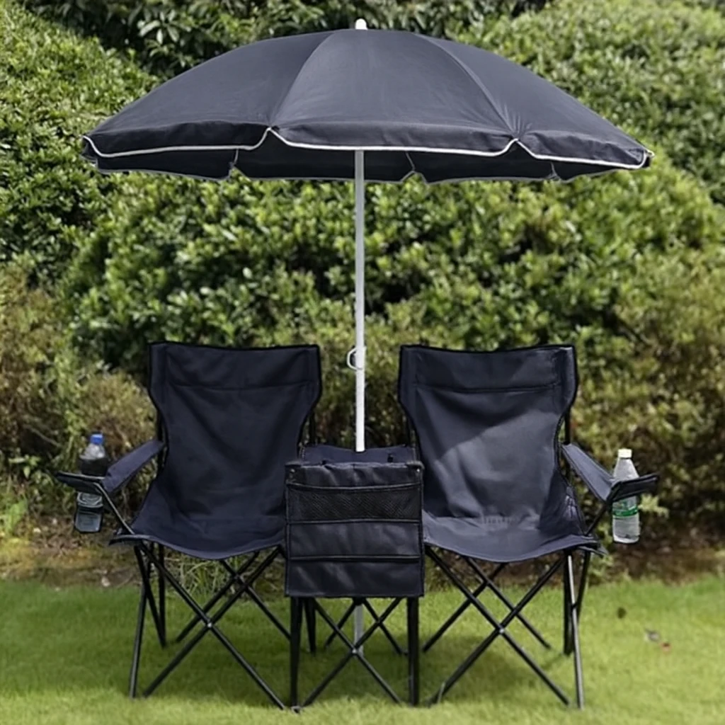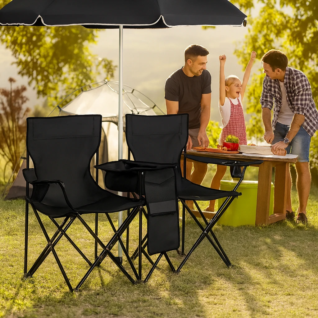 The Portable 2-Seat Folding Camping Chairs with Umbrella is the perfect setup for relaxing outdoors with a partner, friend, or family member. Designed with comfort and convenience in mind, this dual-chair design includes a built-in center table, cooler bag, beverage holders, and a handy side pocket. The adjustable and removable umbrella provides shade whenever needed, while the weather-resistant oxford fabric and strong steel frame ensure durability in outdoor environments. Easy to fold, store, and carry, this 2-seat chair set is ideal for beaches, parks, camping trips, backyard lounging, and picnics.