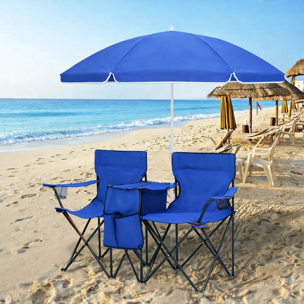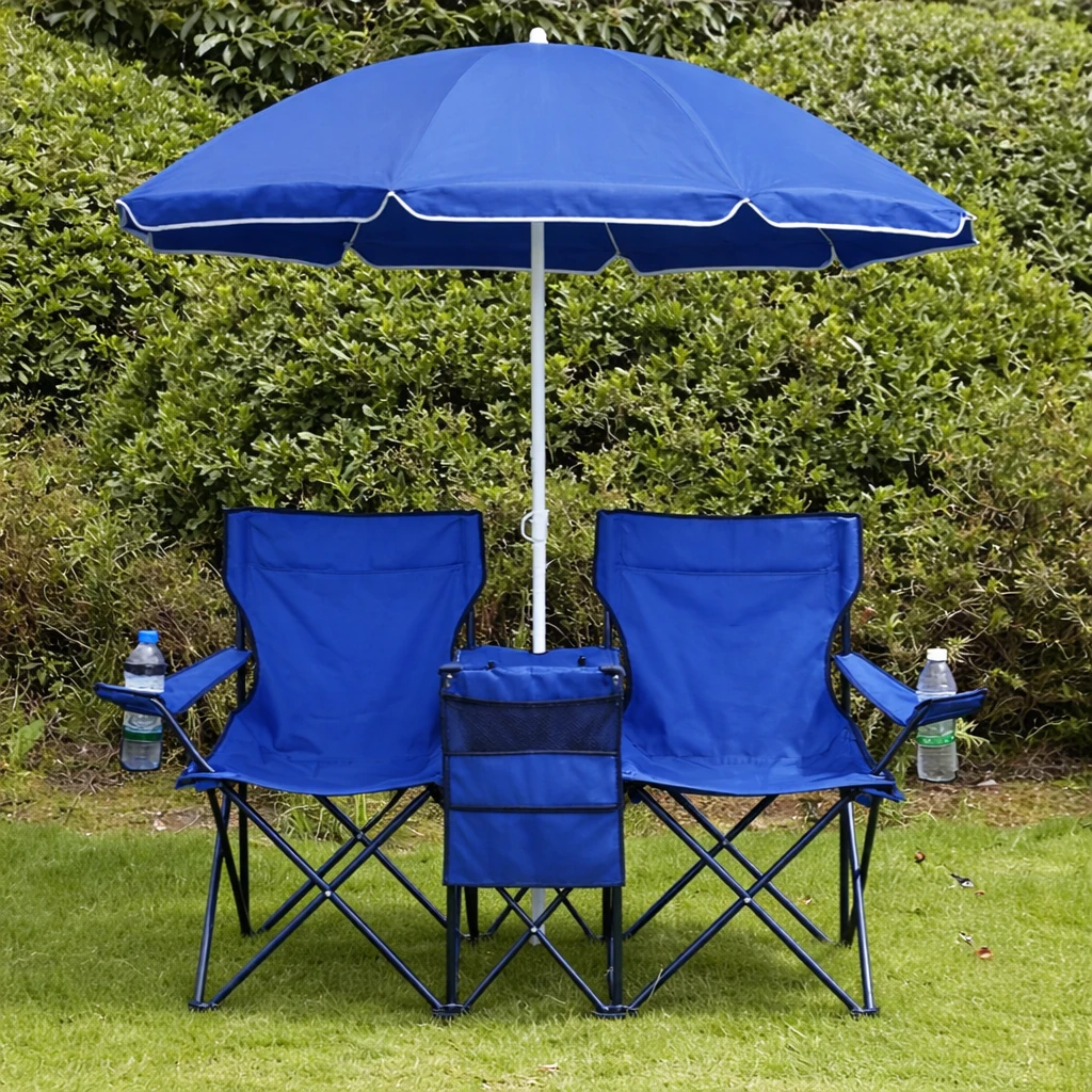 The Portable 2-Seat Folding Camping Chairs with Umbrella is the perfect setup for relaxing outdoors with a partner, friend, or family member. Designed with comfort and convenience in mind, this dual-chair design includes a built-in center table, cooler bag, beverage holders, and a handy side pocket. The adjustable and removable umbrella provides shade whenever needed, while the weather-resistant oxford fabric and strong steel frame ensure durability in outdoor environments. Easy to fold, store, and carry, this 2-seat chair set is ideal for beaches, parks, camping trips, backyard lounging, and picnics.