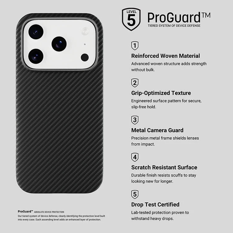 The HYPHEN KODE Slim Reinforced Case is the ultimate fusion of tactical strength and minimalist precision. Crafted from real aramid fiber (Kevlar weave), it delivers military-grade protection in a sleek and lightweight profile. The dual-layer build of TPU frame and PC backing ensures durability while maintaining a slim fit that complements your iPhone 17 Pro’s elegant design. Featuring raised bezels for screen and camera protection, anti-slip laser texture, and anti-fingerprint matte coating, this case is designed to perform in any environment. Integrated MagSafe compatibility provides seamless wireless charging and secure magnetic accessory attachment. Built to military standards, it ensures everyday resilience with professional style.