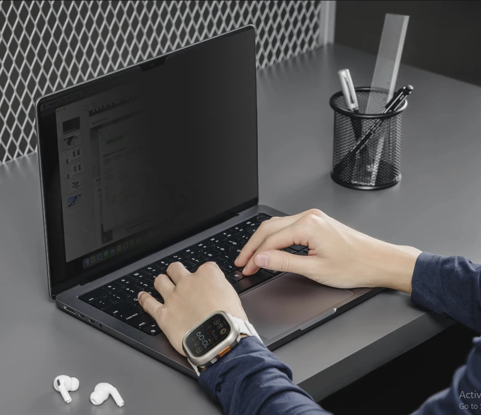 The MagEasy Guard (Privacy) is a premium magnetic privacy screen protector designed exclusively for the MacBook Pro 14”. It offers a 60° narrow viewing angle to safeguard your confidential information while maintaining crystal-clear display quality. Crafted from high-quality PET material, it ensures durability, reduces blue light emission, and minimizes glare to protect your eyes during long use. Its ultra-thin 0.69mm profile fits perfectly on your MacBook without affecting screen clarity or touch. Easy to attach and remove magnetically, it also comes with a protective sleeve and microfiber cloth for convenient storage and care — ideal for professionals on the go.