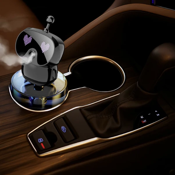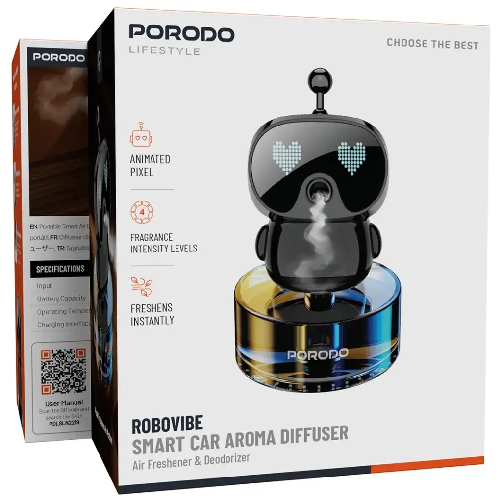 Refresh your car or indoor space instantly with the Porodo Robovibe Smart Car Aroma Diffuser—a sleek, compact, and modern solution for everyday freshness. Equipped with a 50mL oil tank and a rechargeable 300mAh battery, it delivers continuous aroma with four adjustable intensity levels, allowing you to customize the fragrance to your preference. Its high-quality fragrance distribution and deodorizing function keep your environment smelling clean and pleasant at all times. The USB-C interface ensures quick and efficient charging, and with an operating temperature range of 0°C to 60°C, it performs reliably in all weather conditions. Designed to fit perfectly into standard car cup holders, the Robovibe also features a fun animated pixel display that adds a unique, stylish touch to your space. Whether you're driving or relaxing at home, this smart diffuser keeps your surroundings fresh with ease.