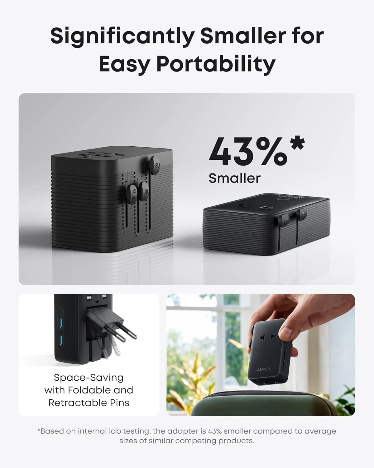 The Anker 20W 5-in-1 Nano Travel Adapter is the compact all-in-one solution for your travel charging needs. Equipped with a single AC outlet and four USB ports (2× USB-C and 2× USB-A), it lets you power multiple devices at once while you’re on the go. With a sleek, ultra-compact form and retractable/foldable plug pins, it fits easily in your suitcase or carry-on. Delivering up to 20W fast charging from one USB-C port and built for over 200 countries with four plug standards, this adapter is perfect for travelers and digital nomads.
