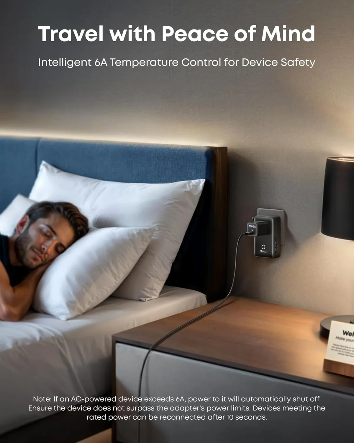 Universal input 100–240V, 50/60Hz — ideal for international travel.