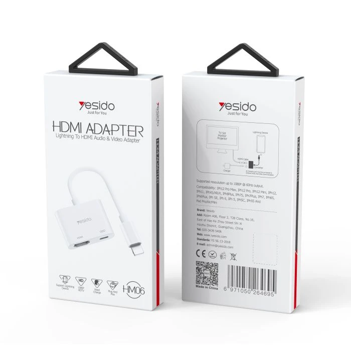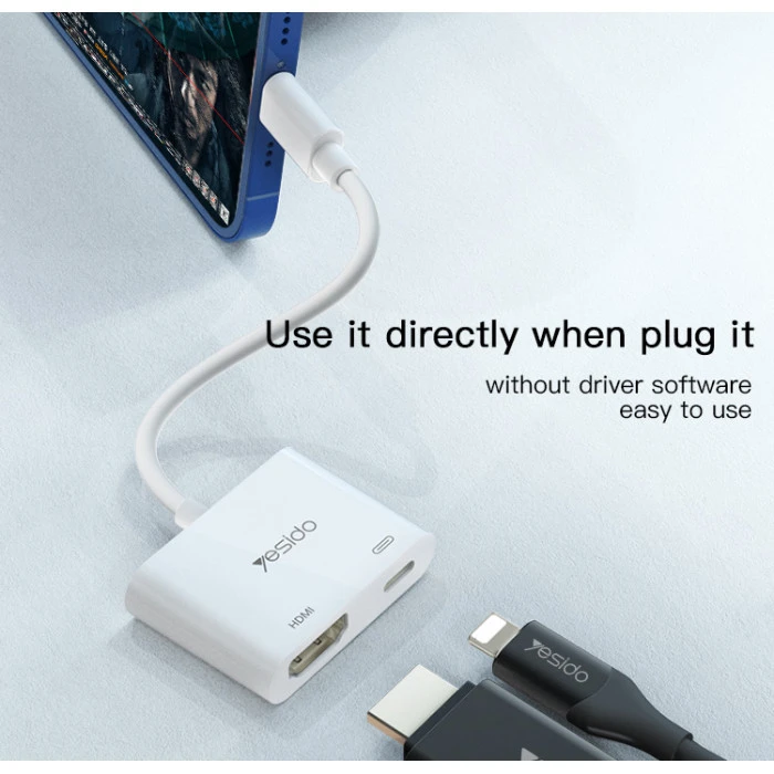 The Yesido HM06 Lightning to HDMI + Lightning Charger Adapter offers an easy way to connect your iPhone or iPad directly to HDMI-enabled displays for high-quality video and audio playback. With support for resolutions up to 4K 60Hz, it delivers clear and smooth visuals. The additional Lightning charging port allows you to power your device while streaming, making it perfect for presentations, movies, and gaming. Its compact 10cm design ensures portability and convenience.