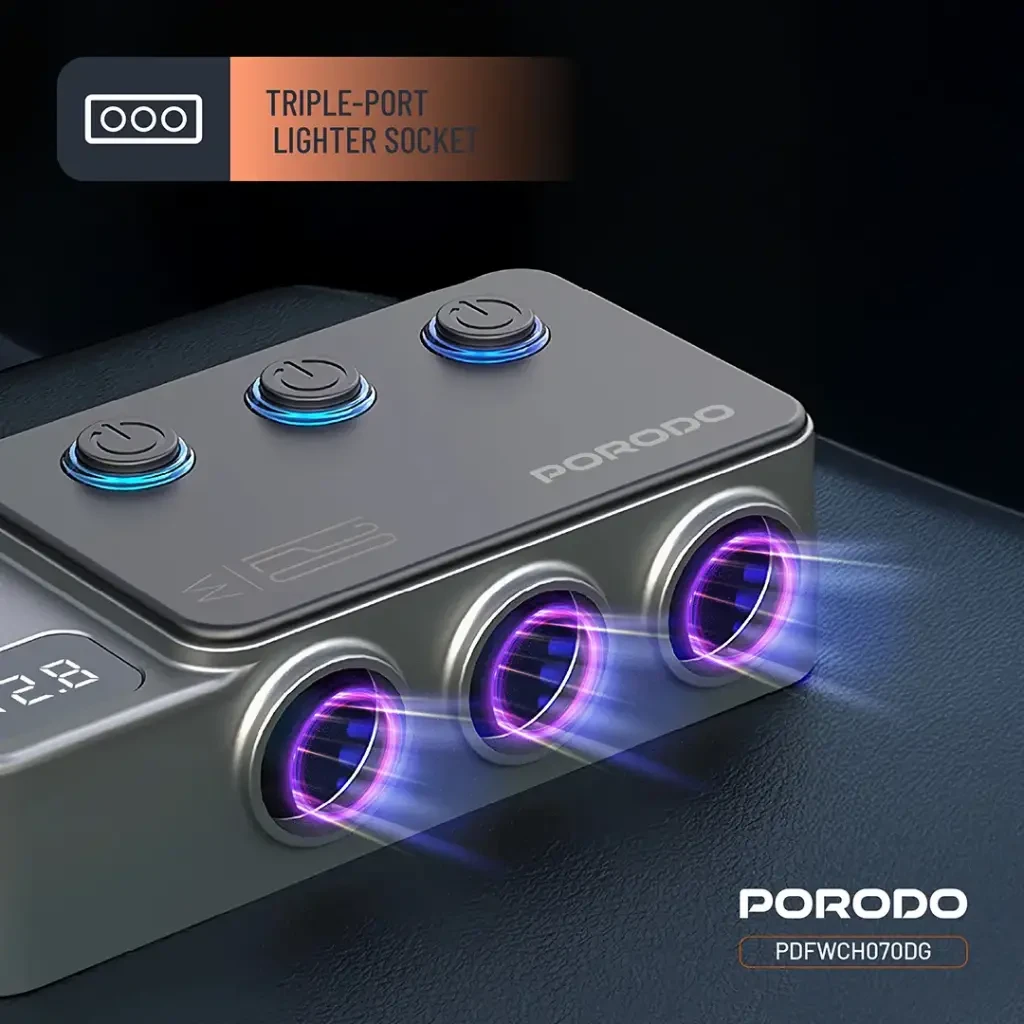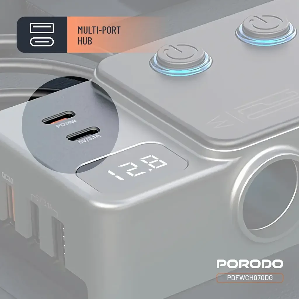 The Porodo 120W Car Charger Hub is a powerful and versatile in-car charging solution designed to keep all your devices powered while on the road. With a wide input compatibility of DC 12V–24V, this hub delivers a total output of 120W, allowing multiple devices to charge simultaneously without performance loss. Equipped with two USB-C ports and three USB-A ports, it provides fast and efficient charging for phones, tablets, and other gadgets.