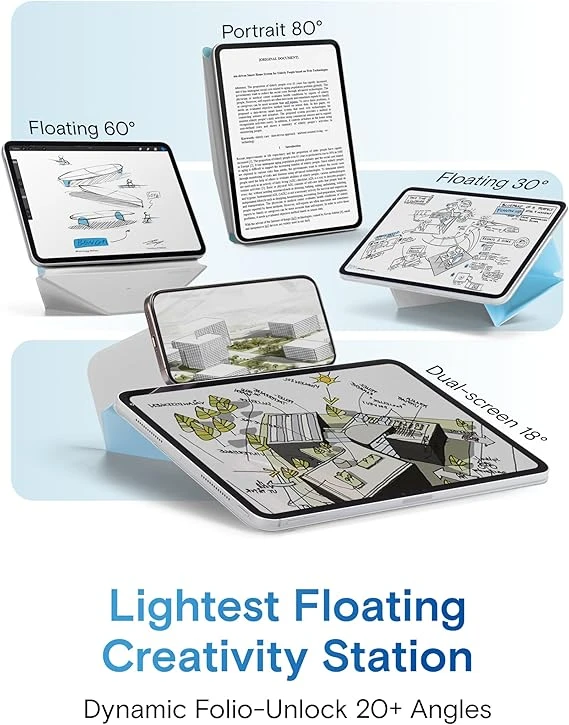 The MOFT Dynamic Folio Case brings together minimalist design and versatile functionality. With 20+ adjustable angles, it flows effortlessly from work to creativity, keeping your iPad aligned with your needs. Its ergonomic floating mode lifts your iPad by 2 inches, providing comfortable angles between 30° and 60° for typing, sketching, or viewing. Weighing only 10.5oz, it offers slim, lightweight protection without bulk. Built with super-strong N52 magnets and a durable fiberglass structure, it ensures stability and secure support. Made from scratch-resistant MOVAS vegan leather, it delivers durability, sustainability, and premium comfort. The modular pen holder is optional, giving you flexibility for your setup. Perfect for creators, professionals, and anyone who needs dynamic flexibility on the go.