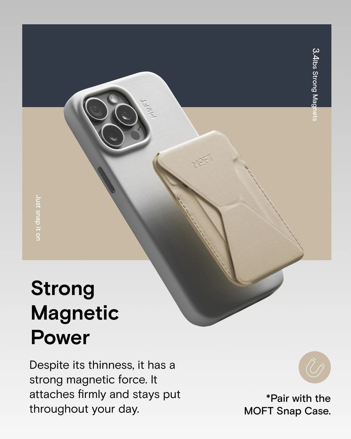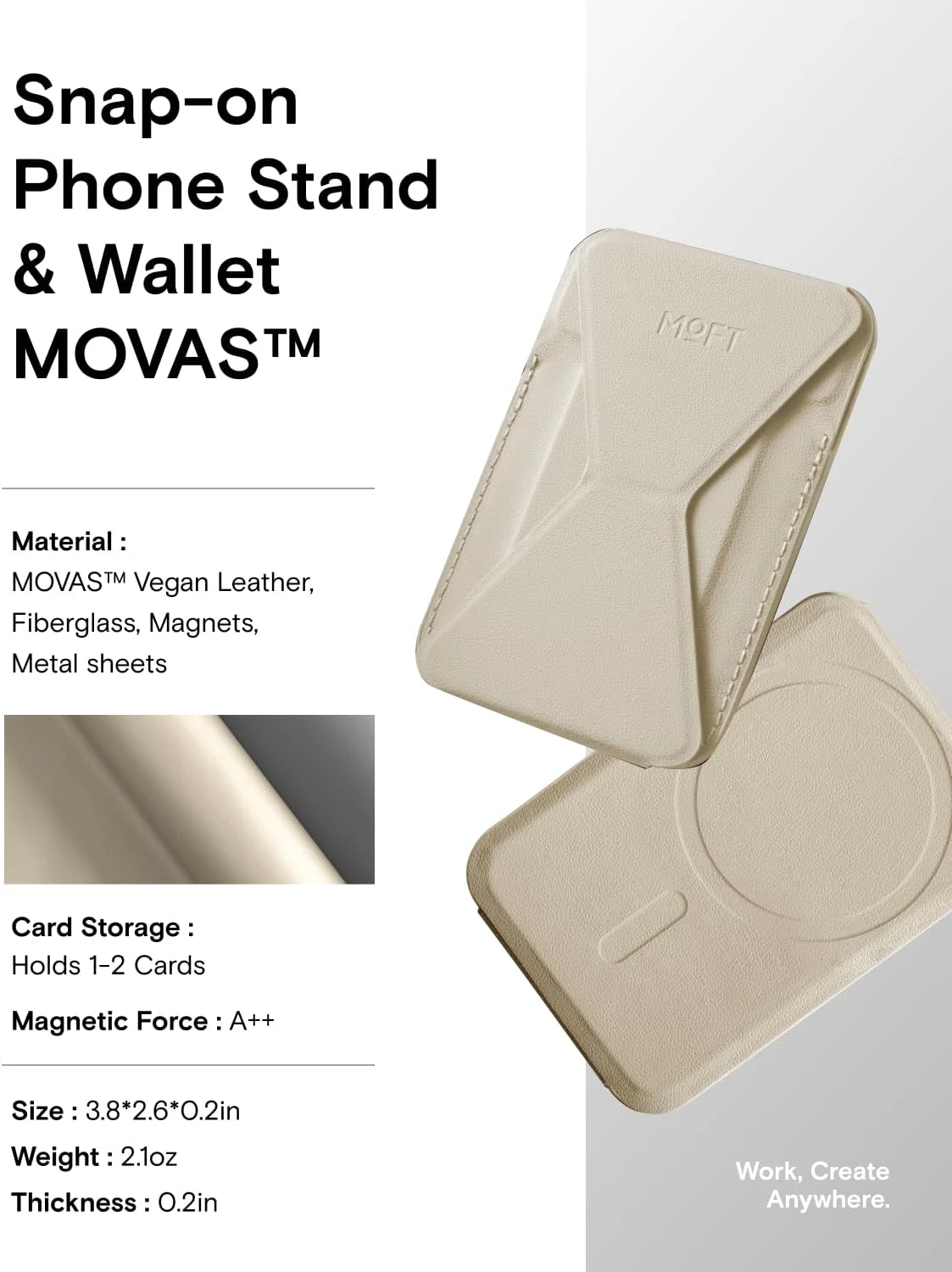 The MOFT Snap-On iPhone Stand & Wallet (MOVAS) is a sleek and practical accessory designed to simplify your everyday carry. It features a built-in wallet that holds up to two cards, keeping your essentials within easy reach. The magnetic stand offers three versatile viewing modes—Portrait, Landscape, and Floating—providing hands-free convenience for watching videos or video calls. Designed to attach securely to MagSafe-compatible iPhones with a strong 15 Newton magnetic force, it’s easy to snap on and remove. Made from durable MOVAS™ vegan leather, this accessory combines style and functionality while seamlessly fitting with Apple’s MagSafe cases and other compatible options.