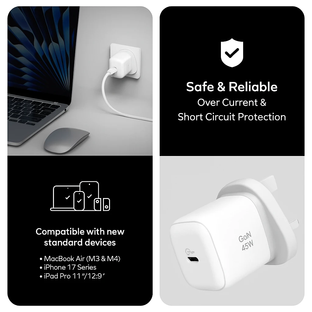 45W GaN Technology: High-speed, efficient charging in a compact design.