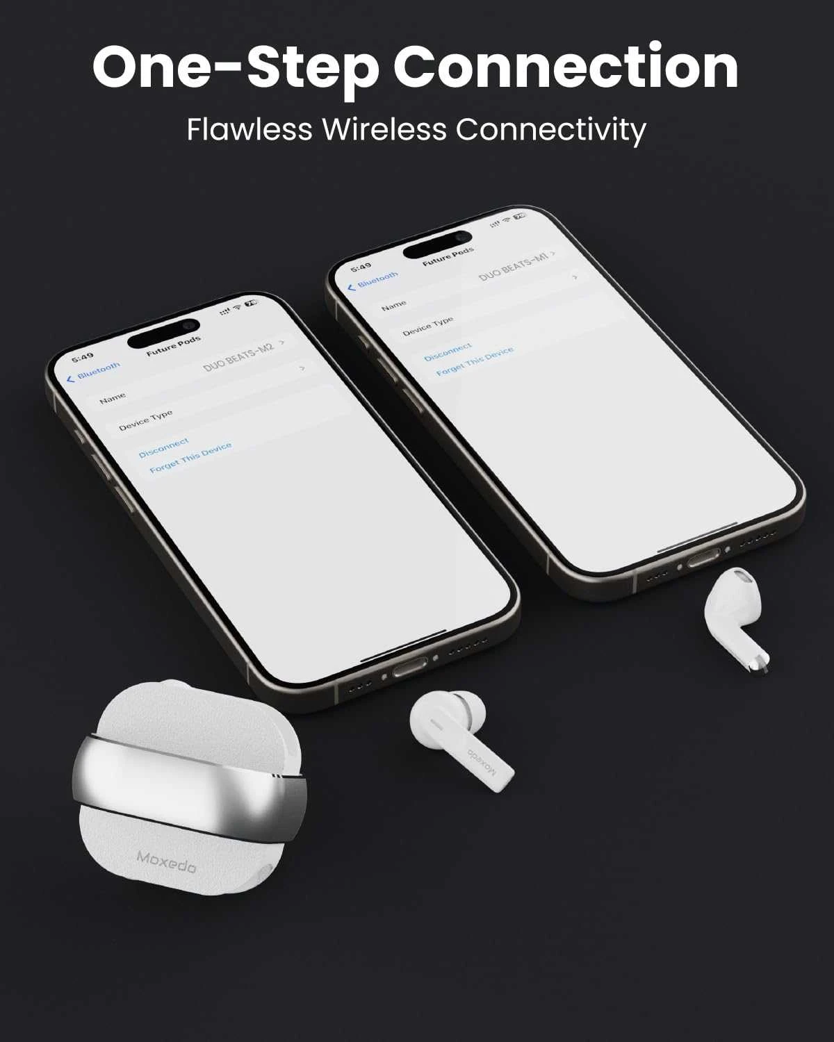 2 PAIRS OF EARBUDS: This Moxedo duo beats combined with a new concept design. These buds come equipped with two pairs of in-ear and half-in-ear earbuds that connect separately to different devices. With 5.3 Bluetooth version, dual-channel calling. Take out the left and right earphones at the same time and pair automatically. Can be paired and connected with a single earphone for single use.
