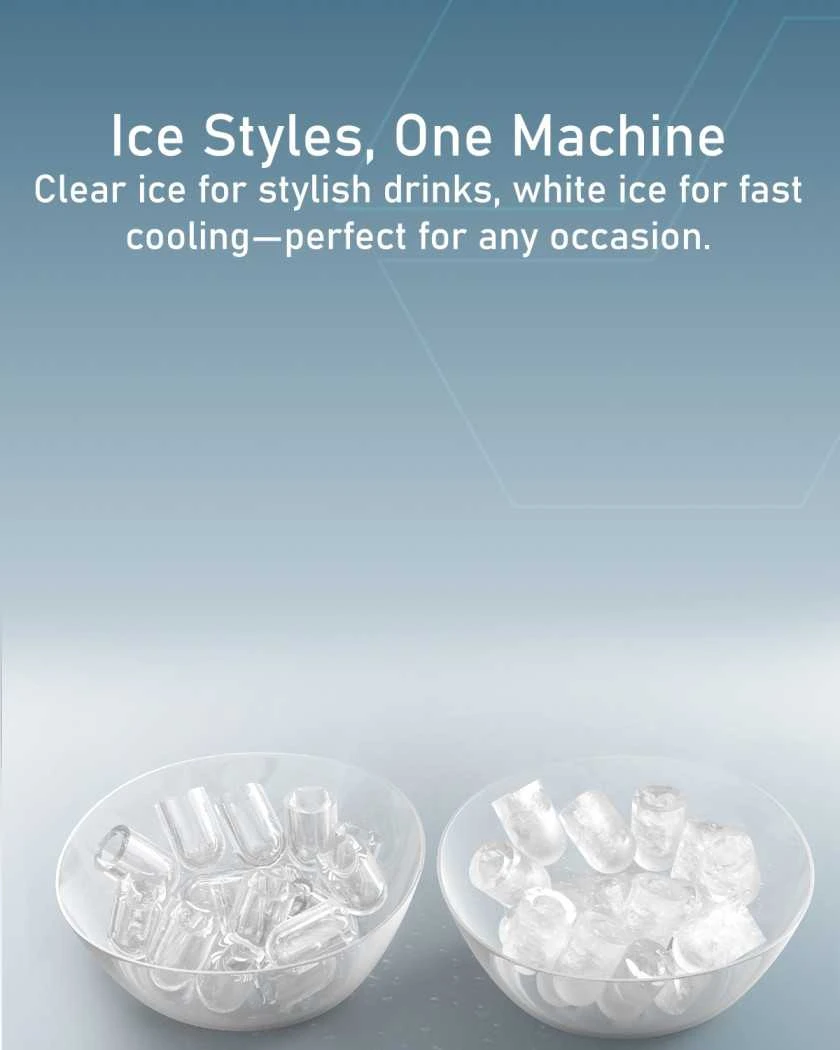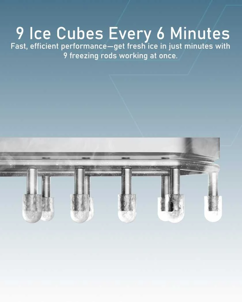 The Moxedo Electric Countertop Ice Maker delivers fast and convenient ice production for home, office, or outdoor use. It can produce 9 ice cubes in just 6 minutes and up to 12kg of ice in 24 hours. The machine features two ice sizes for quick chilling or long-lasting cooling. A self-cleaning function and see-through cover make maintenance easy, while infrared sensors stop production when the tray is full. Quiet operation under 44dB ensures a peaceful environment. Comes with an ice basket and scoop for instant use.