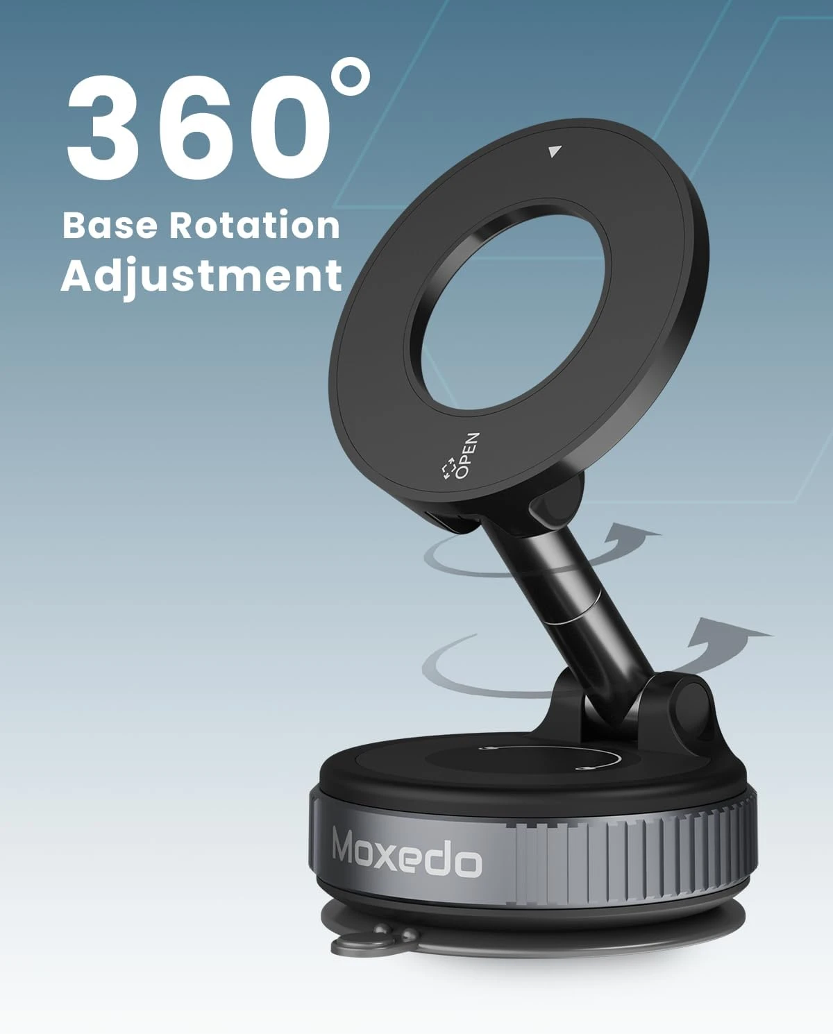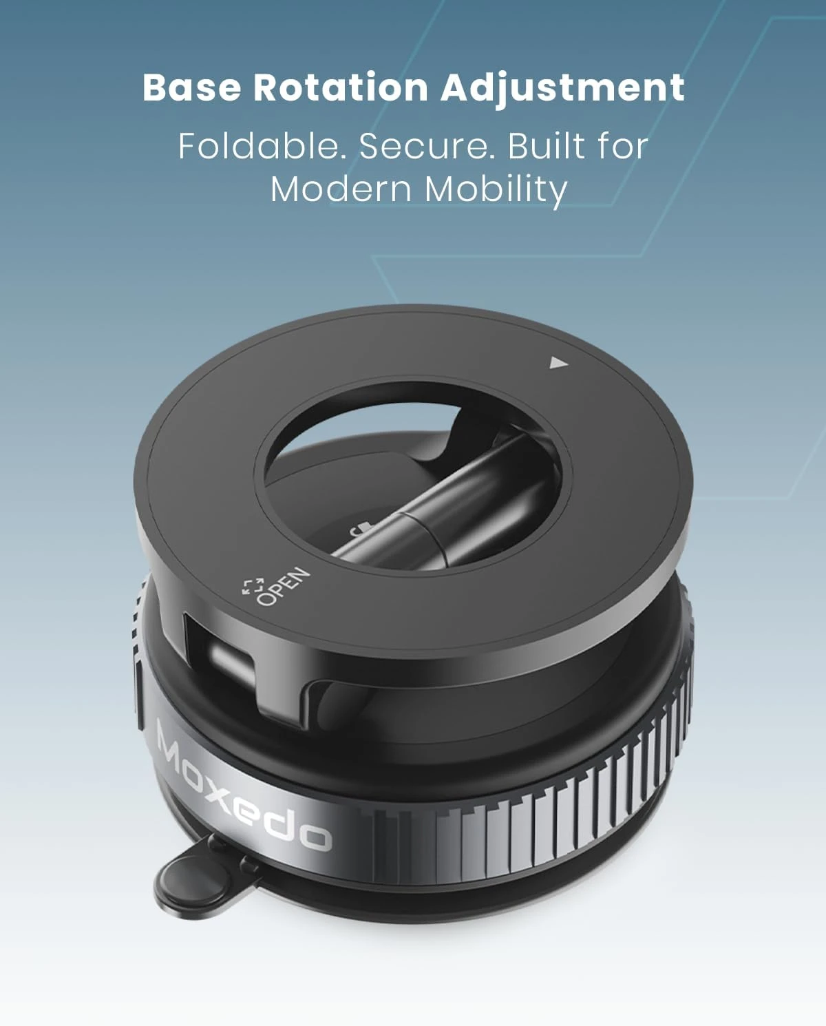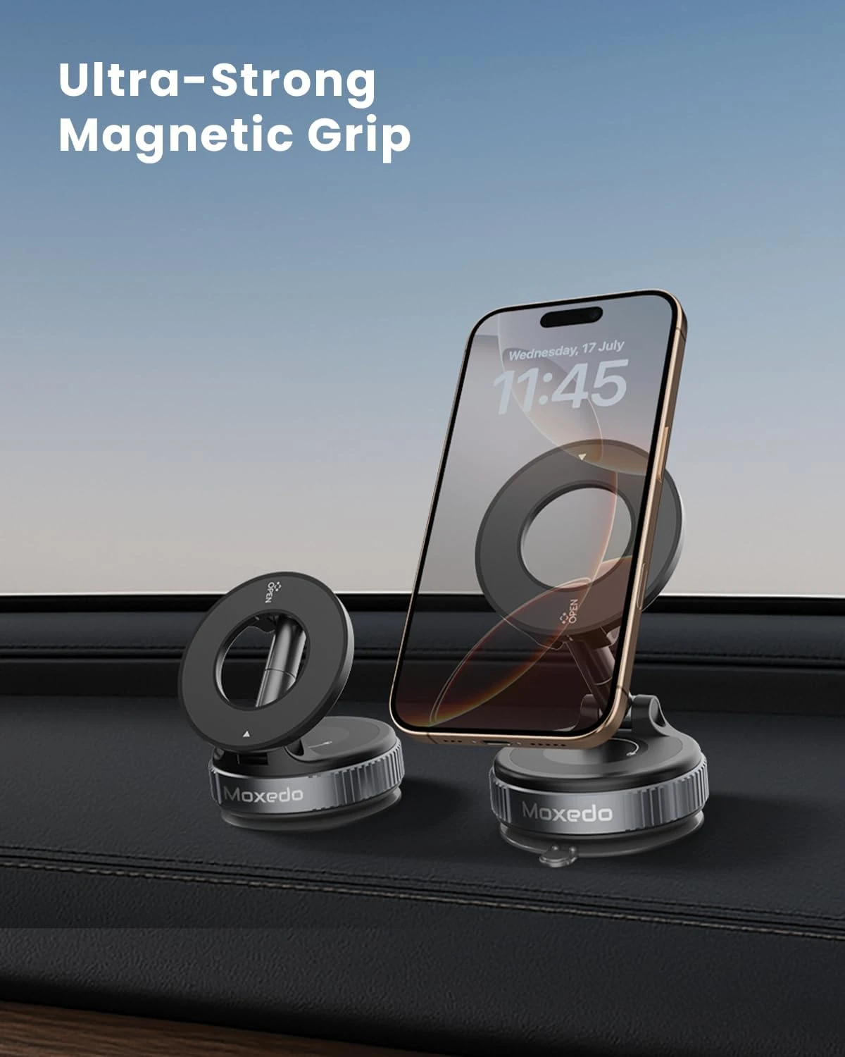 Upgrade your driving experience with the Moxedo Gravix, a foldable MagSafe car phone holder built for stability and convenience. Featuring a durable suction cup with a secure grip, it attaches firmly to dashboards, mirrors, or smooth surfaces — staying steady even on bumpy roads and sharp turns. Dual N52-grade magnets provide a strong magnetic hold for MagSafe iPhones, Samsung, and other smartphones, ensuring your device stays in place. With its 360° adjustable swivel arm, you can set the perfect viewing angle, whether vertical or horizontal, for safe and hands-free driving.