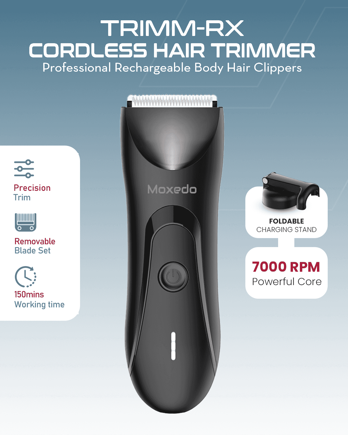 Moxedo Cordless Hair Trimmer – 7000 RPM, Waterproof, USB-C Rechargeable The Moxedo Cordless Hair Trimmer is a versatile, high-performance grooming tool built for both professional barbers and home users. Featuring a precision zero-gap T-blade and a powerful 7000 RPM chip-controlled motor, it delivers smooth, accurate trims for hair, beards, and body grooming. Designed with convenience in mind, it includes a built-in LED torch light for better visibility, a USB-C charging port, and a foldable charging stand. Its cordless, waterproof design ensures easy use and cleaning—making it ideal for travel, daily grooming, or on-the-go touch-ups. Key Features: Built-in LED torch light for enhanced visibility during trimming Cordless or plug-in operation with up to 150 minutes of use Zero-gap T-blade for precise cuts, fades, and beard shaping 7000 RPM chip-controlled motor for powerful, consistent performance USB-C rechargeable—charge via laptop, power bank, or phone adapter Waterproof body for safe use in the shower and easy cleaning Foldable charging stand included for space-saving storage