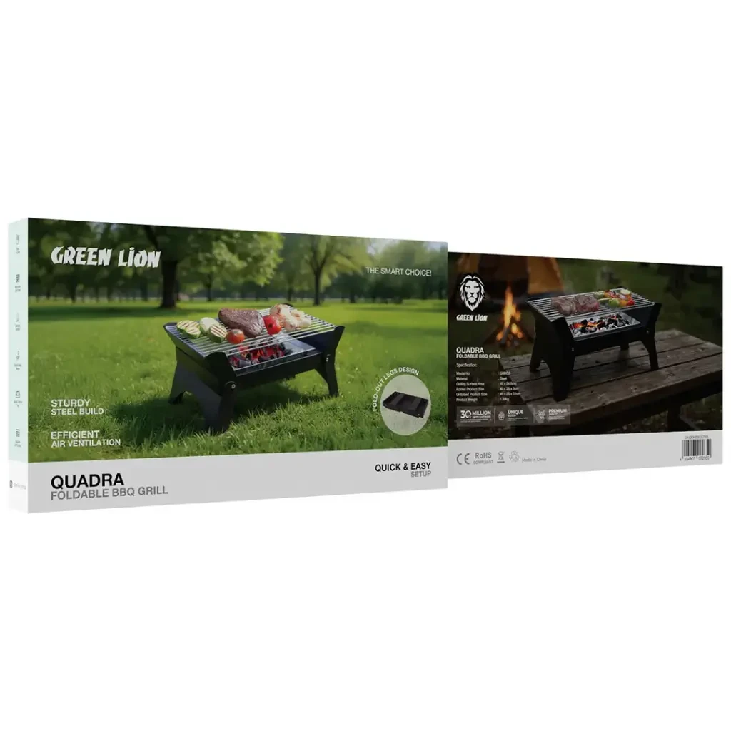 Green Lion Qudra is a compact foldable charcoal grill made for outdoor BBQs, camping, and picnics.