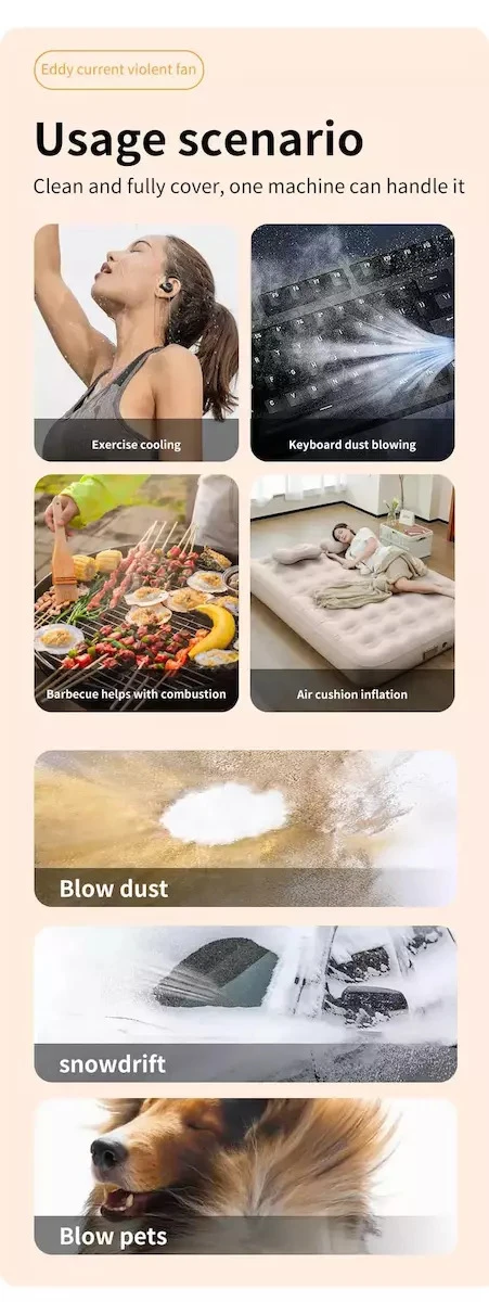 The Multifunctional Lighting Violent Fan F021 is a compact yet incredibly powerful handheld cleaning tool designed for home, office, and car use. Powered by a high-speed brushless motor reaching 130,000 RPM with airflow up to 52m/s, it easily removes dust, debris, leaves, and dirt from keyboards, electronics, vents, and tight spaces. It includes multiple nozzle heads for various cleaning needs, along with built-in LED lighting featuring 6 modes for dark environments. Equipped with two 21700 batteries, it offers up to 4 hours of runtime at low speed and includes Type-C charging with safety protections. A magnetic base, emergency cutting blade, and LED battery indicator make it even more versatile for daily use.