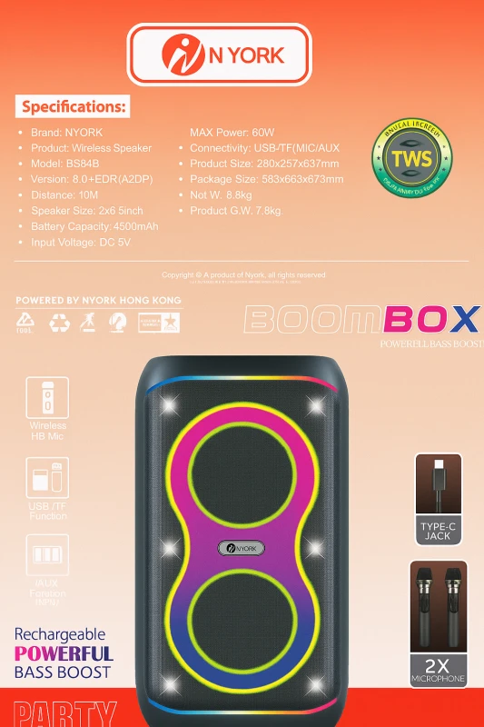 Turn any moment into a full-blown party with the NYork BoomBox BS945 Wireless Bluetooth Speaker, designed for powerful sound, deep bass, and nonstop entertainment. Equipped with dual 6.5-inch drivers and delivering up to 60W of maximum power output, this speaker transforms your gatherings with immersive, room-filling sound.