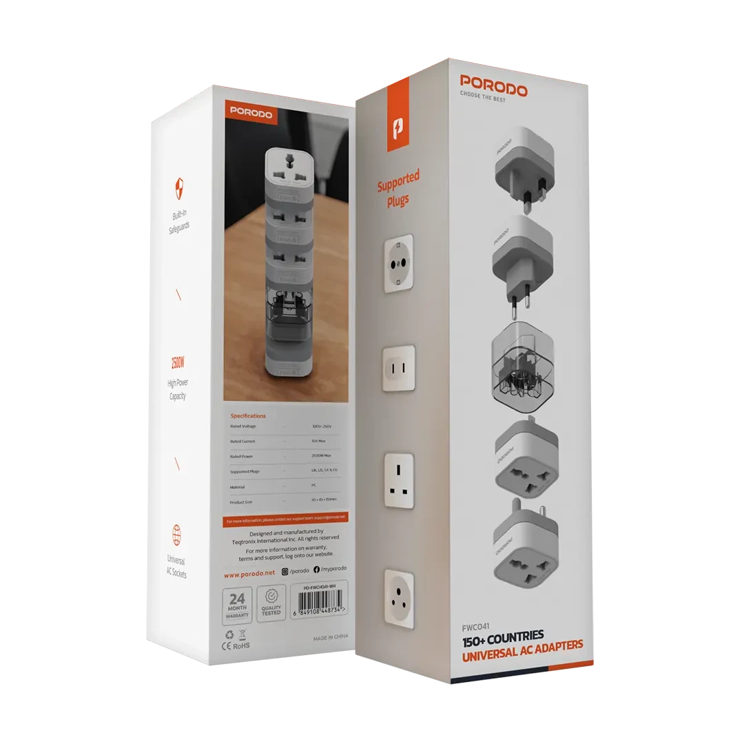 The Porodo 150+ Countries Universal AC Adapter in white is a versatile travel companion, ensuring seamless charging across the globe.