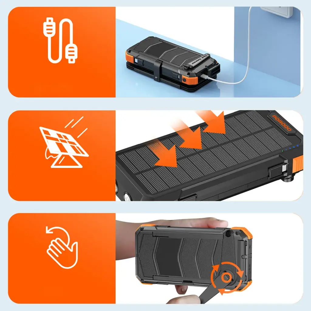 The Porodo Power Bank of 20,000mAh 4-panel solar is one of the most powerful and versatile charging solutions for outdoor or emergency use. This is one of the devices you can count on for backup battery in a huge 20,000mAh battery. It comes in inputs and outputs, including Type-C, Micro USB, and USB-A. This device can be fast charged up to 20w and supports PD of 45 watts. You can recharge the power bank through sunlight with a built-in 4-panel solar system, which is excellent for outdoor use. This gadget contains features such as hand crank charging, a flashlight in multiple modes, and removable cables. It is ideal for all rough conditions as it holds IP45 against water and operates between temperatures of -10 0 C and 40 0 C.