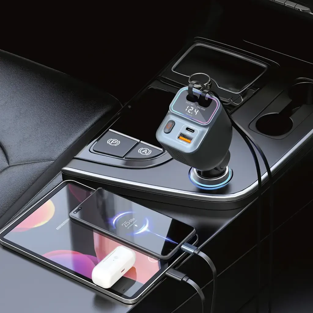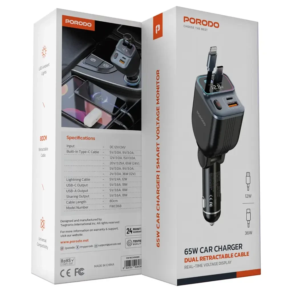 The Porodo 65W Car Charger is designed for fast and efficient charging on the go. It works with both 12V and 24V vehicle inputs, making it suitable for most cars. The built-in retractable 80cm USB-C cable delivers up to 65W at 24V or 36W at 12V, while the Lightning cable provides 12W charging for Apple devices. Additional USB-C and USB-A ports offer 18W each for simultaneous charging of multiple devices. With ambient LED lighting, this charger adds style to your car while keeping your devices powered and organized. Perfect for long drives and daily commutes.